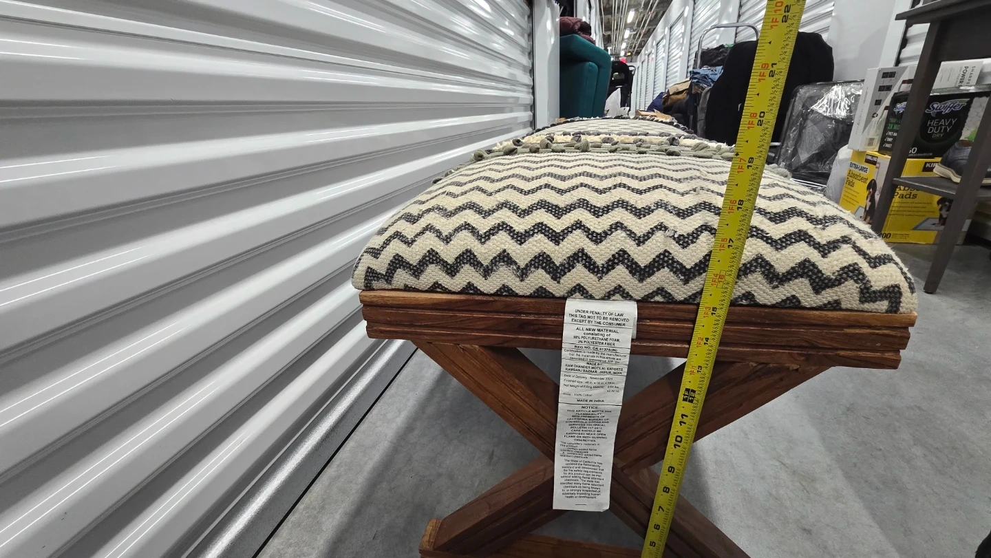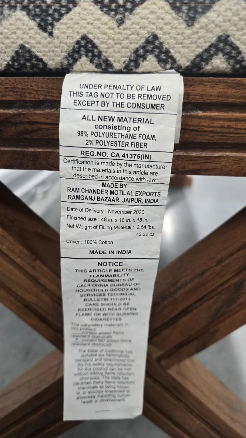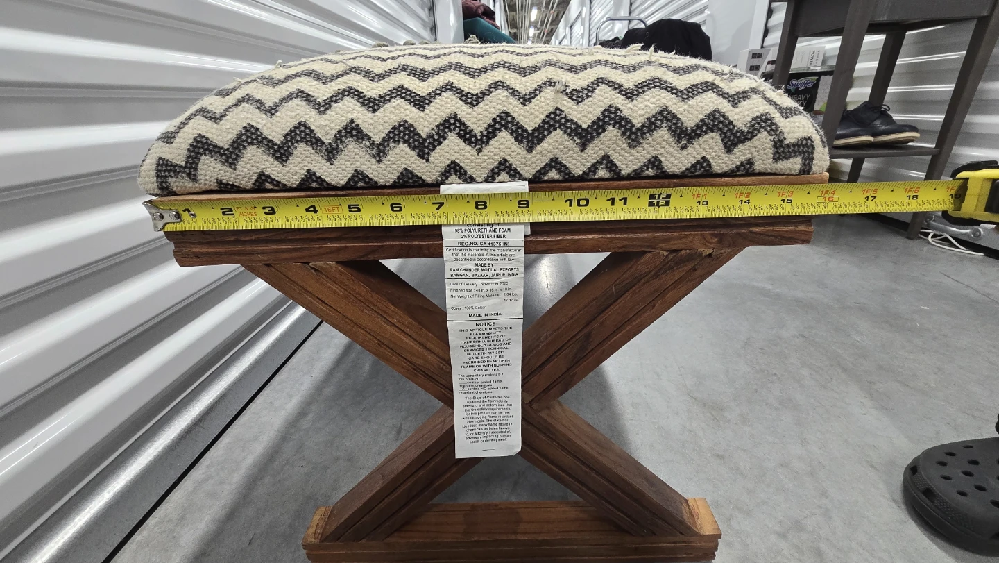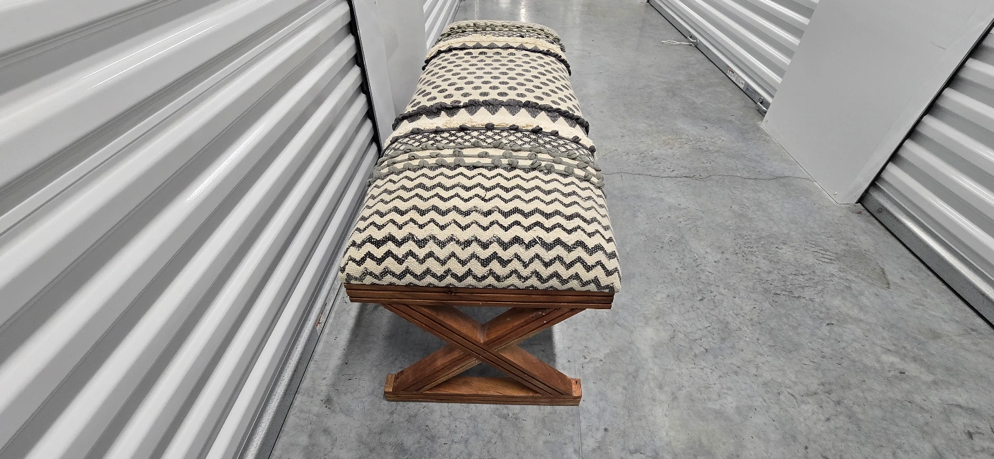 This Unique Bohemian Style bench features a patterned fabric cushion and a dark wood X-shaped base. Perfect for entryway or bedroom.