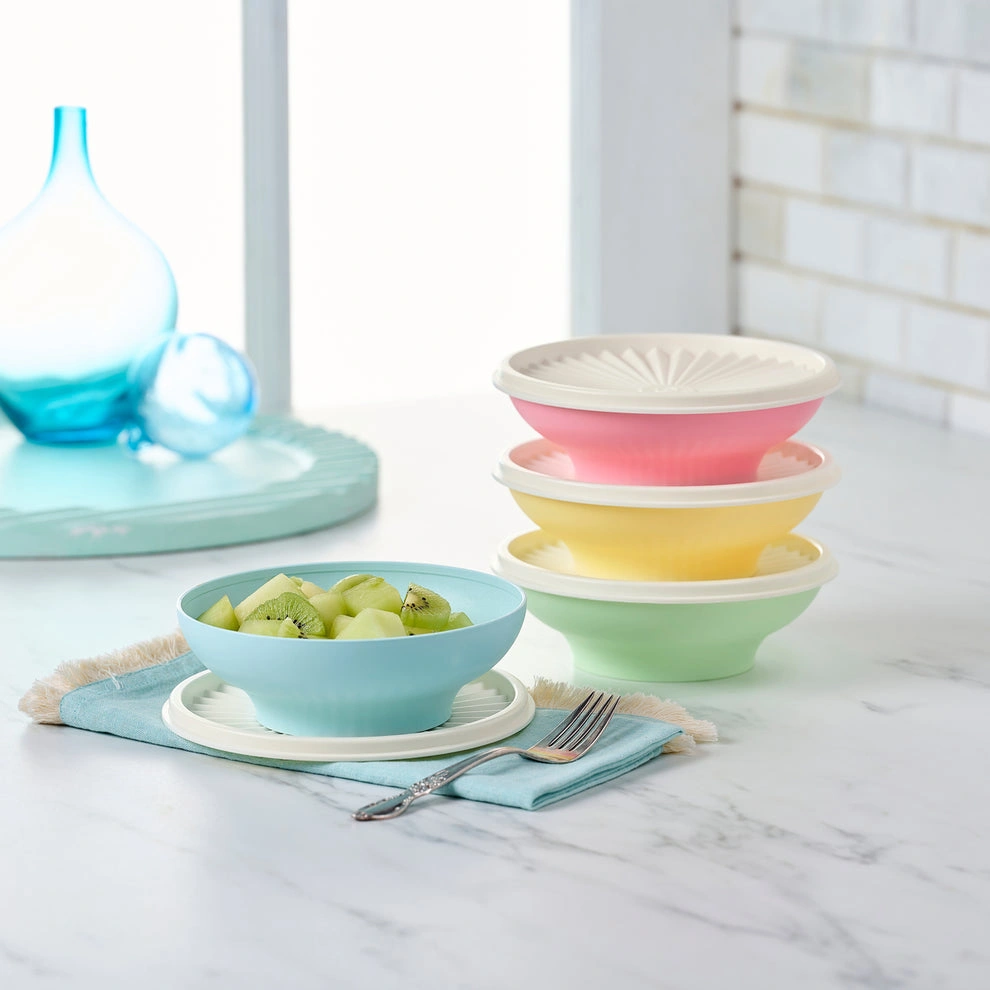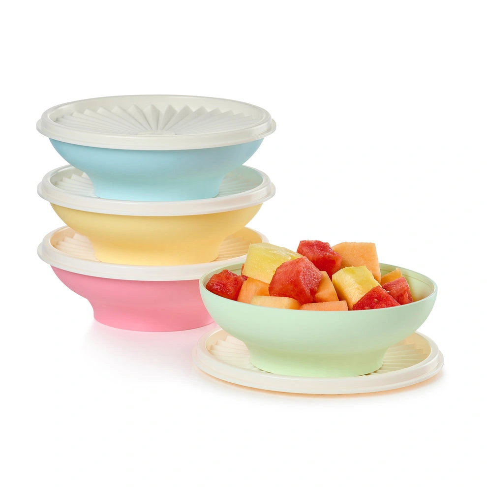 Four colourful bowls, pastel colours. Each bowl includes a lid. Great for leftovers or serving snacks. Set of four 1½-cup/400mL bowls with seals Color: Aquamarine, Vanilla Ice, Milky Mint, Soft Candy