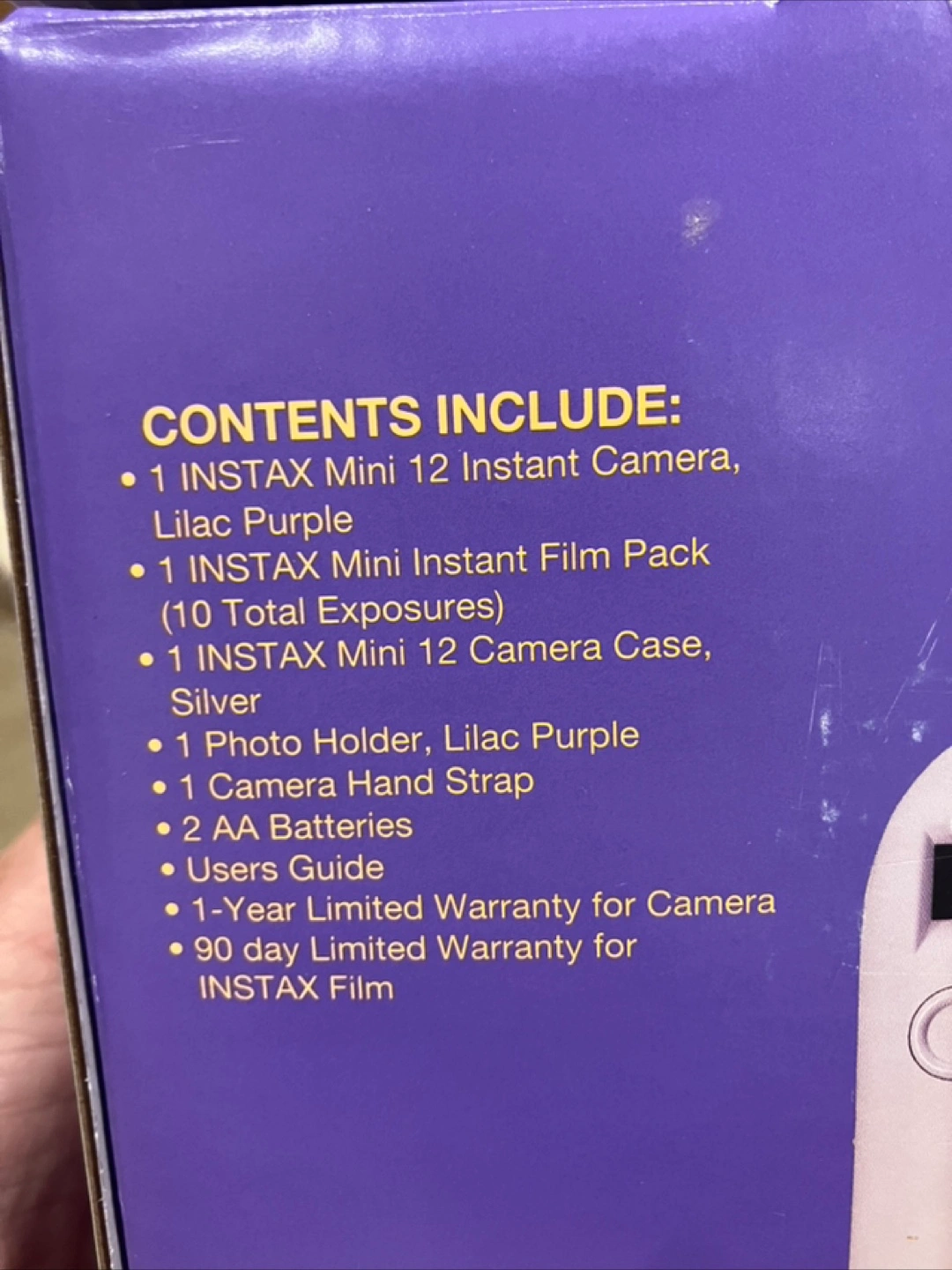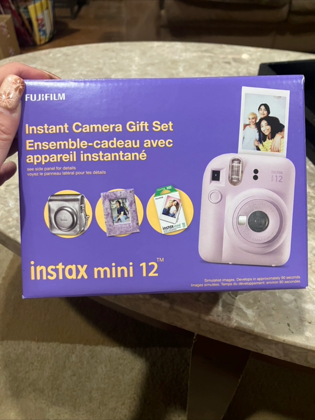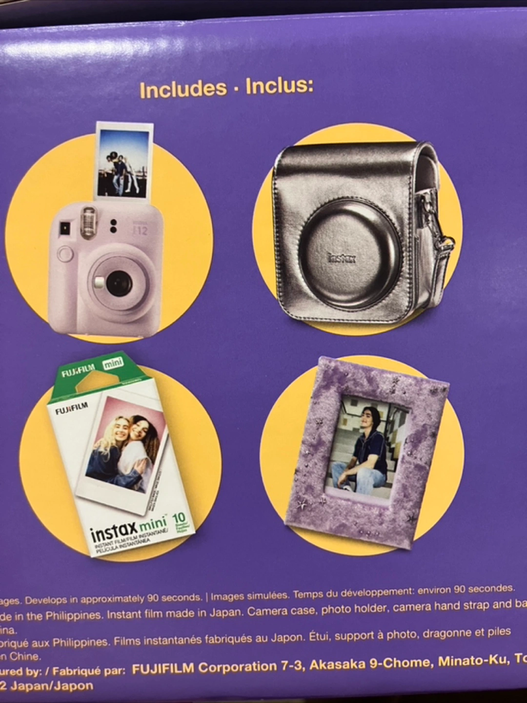 BNIB New Instax Mini 12 instant camera gift set. Lilac purple gift set includes: camera, silver case, photo holder, and camera hand strap included. Ten exposures of film included. Cash only, p/up in Thornhill, Yonge St south of Hwy 7/407