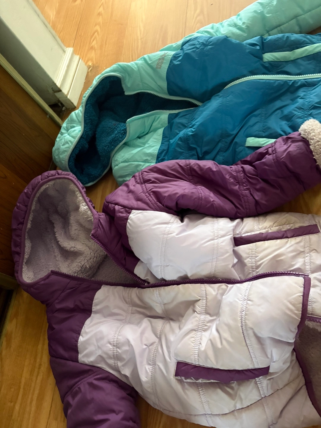 254Two lightly used girls' winter coats. One teal and light blue, one purple and lavender. Both have fleece-lined hoods. no tear just need to wash $20 each or Get all for $30