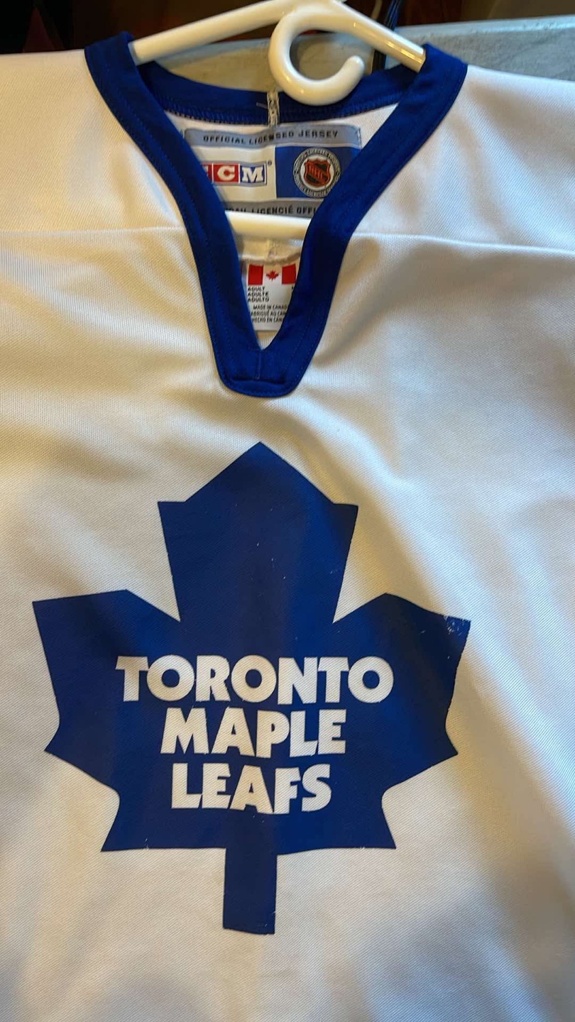 Vintage Toronto Maple Leafs hockey jersey. White with blue accents. Officially licensed. Adult size.