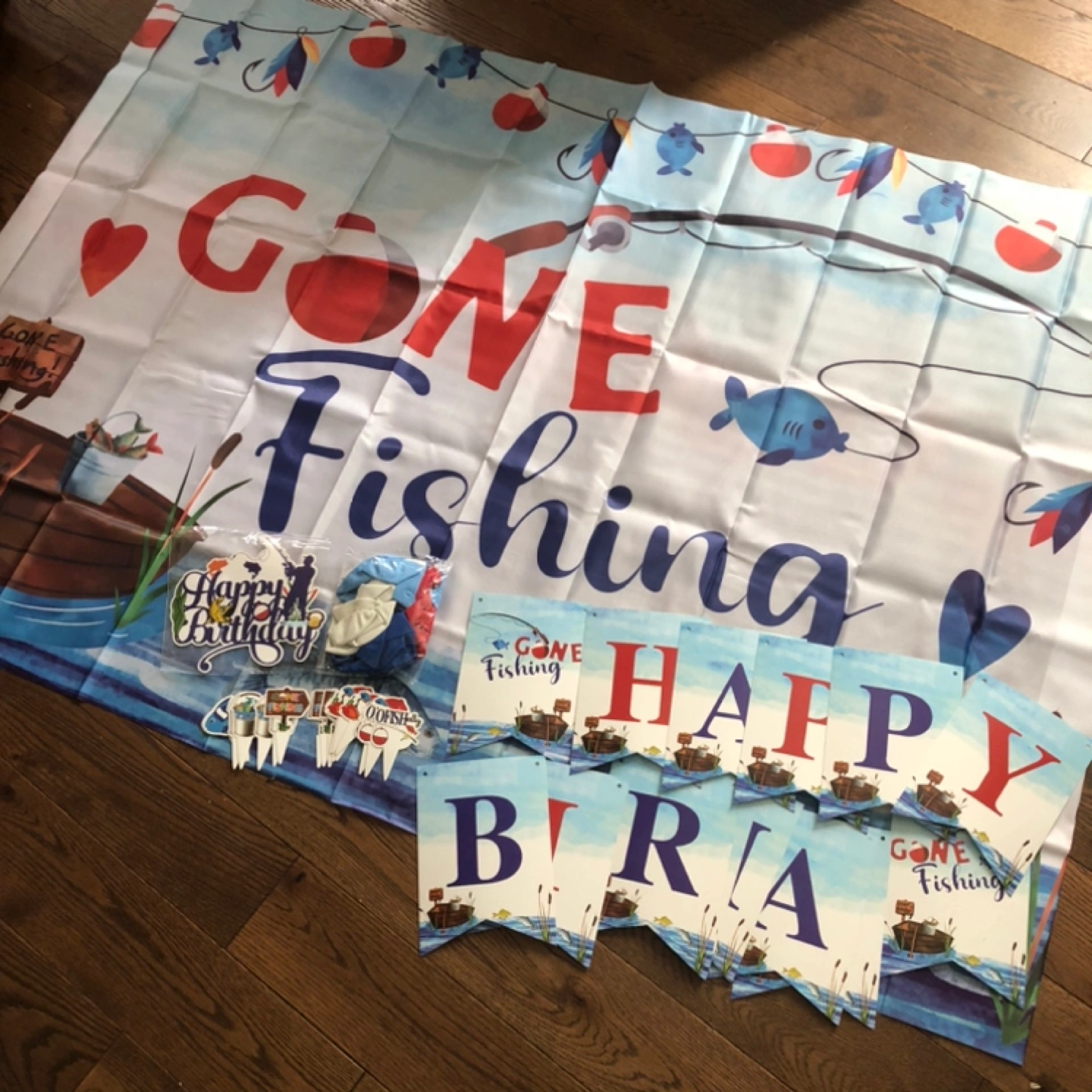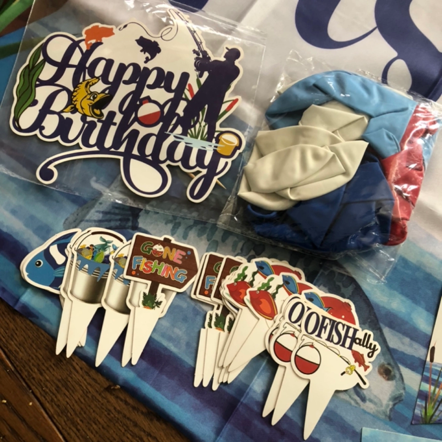 Fishing themed birthday party supplies. Includes banner, cake topper, cupcake toppers, and balloons. Perfect for a boy's birthday.