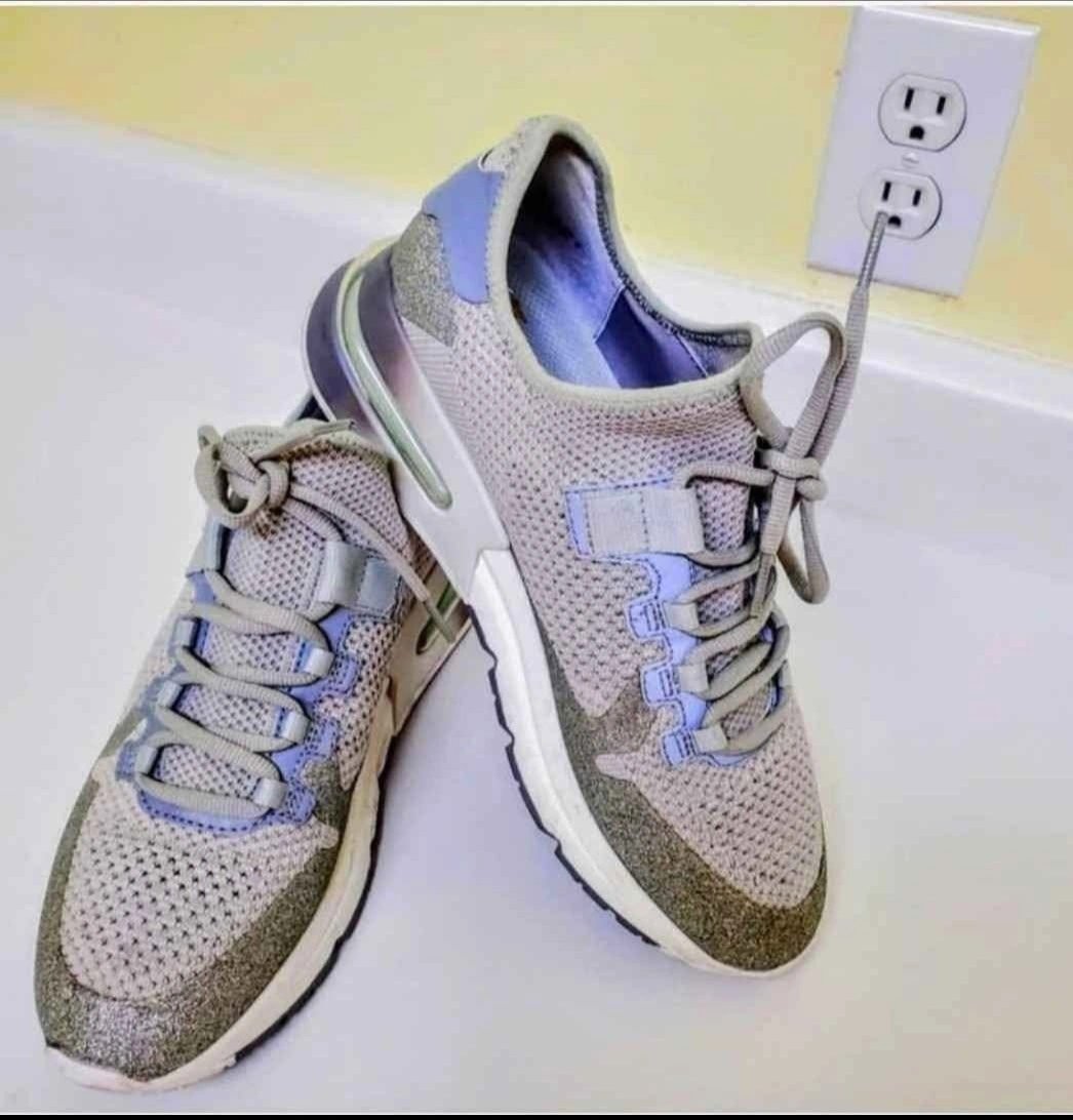 49Pair of grey knitted sneakers. Features light accents and laces. Comfortable casual shoes. Size 9.
