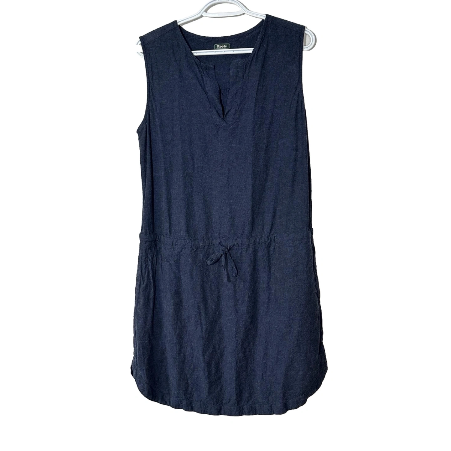 Dark blue linen sleeveless dress. Relaxed fit. V-neck. Drawstring waist. Side pockets. Great for summer.