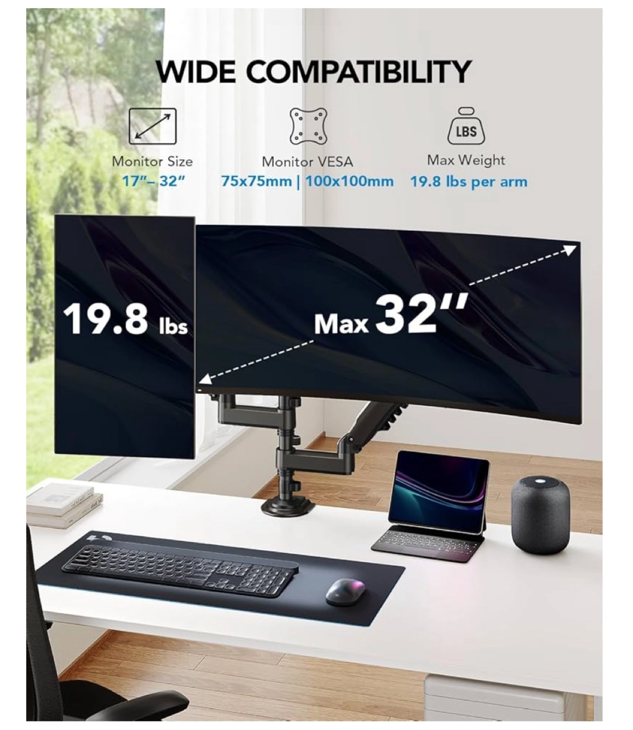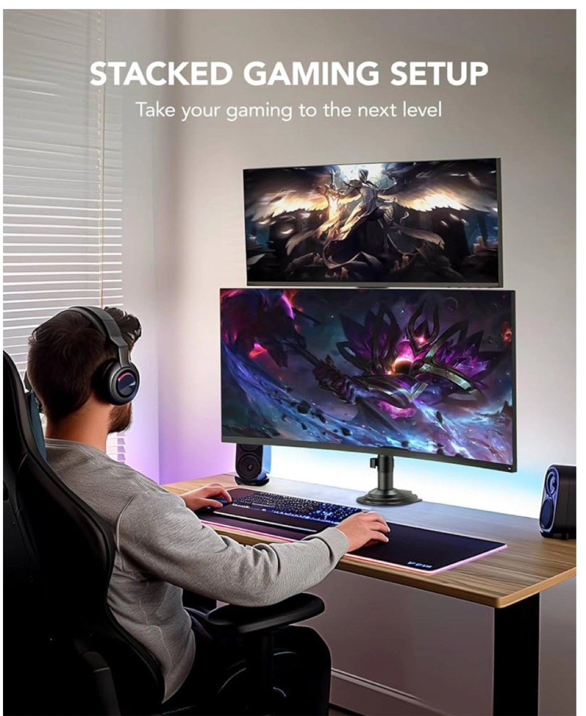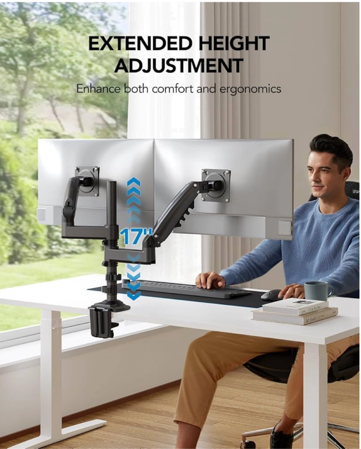 Heavy-duty dual monitor mount. Supports two screens. Adjusts height, tilt, and swivel. Clamp and grommet mounting options. Excellent for gaming or office setups.