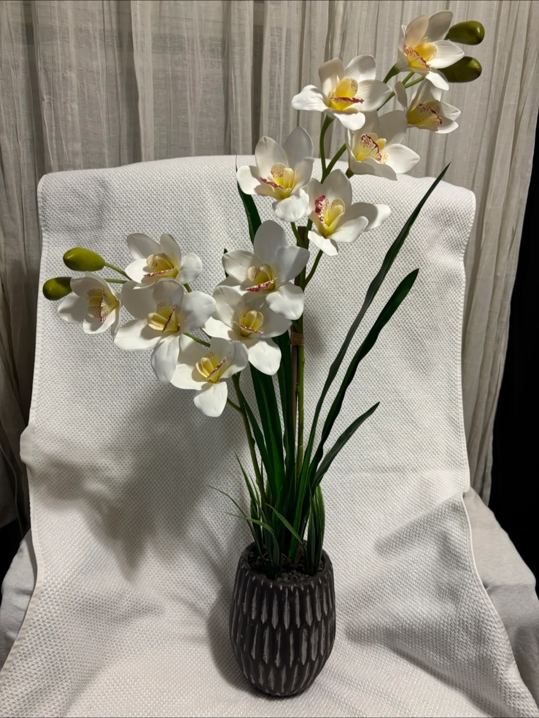 Beautiful artificial orchid arrangement. Features multiple white orchid blooms with maroon speckles. Planted in a dark grey textured pot. Adds elegance to any space.