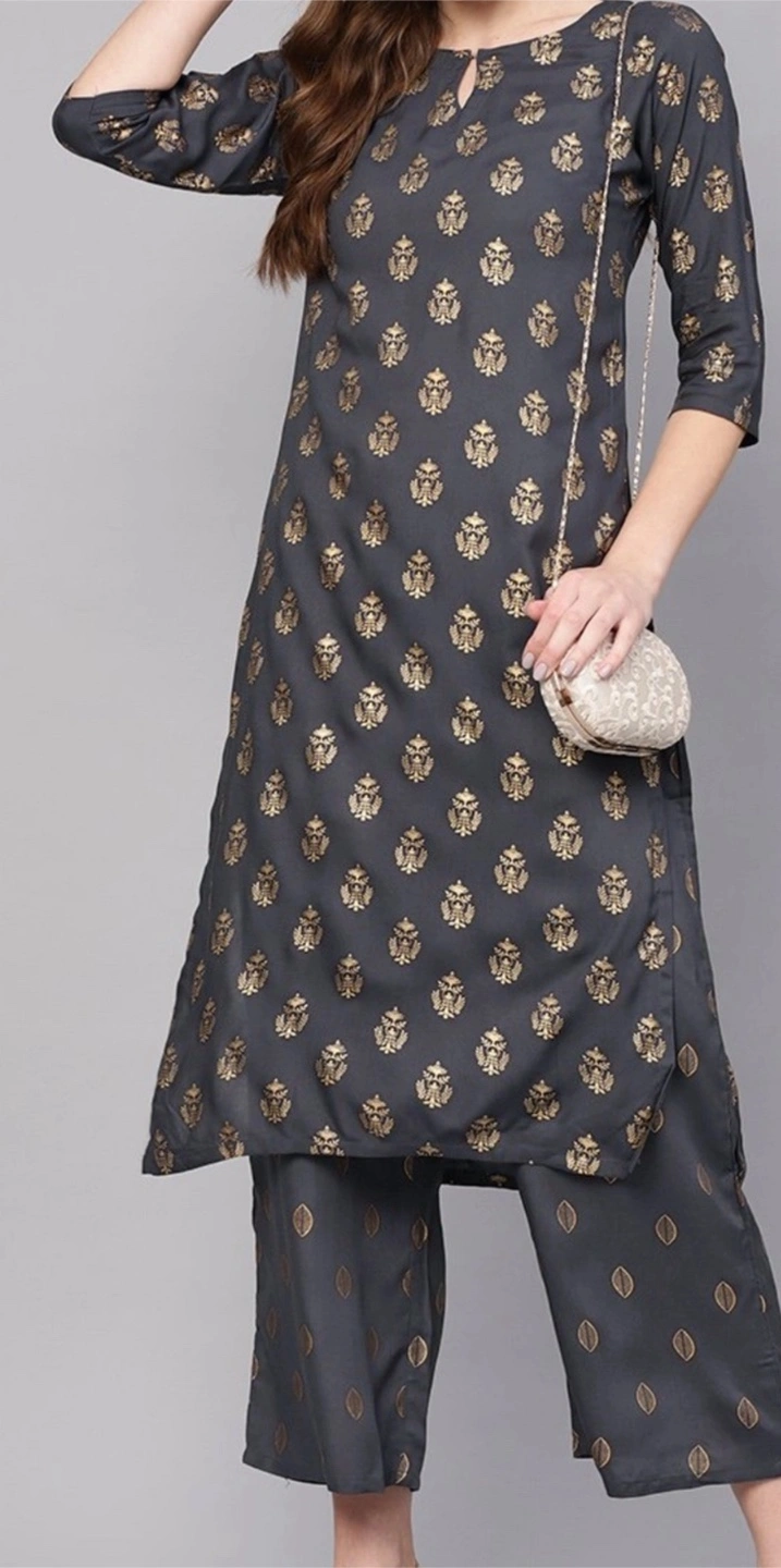 140Beautiful grey kurta with gold detailing. Three-quarter sleeves and a comfortable fit. Matching palazzo pants included. Perfect for a special occasion.