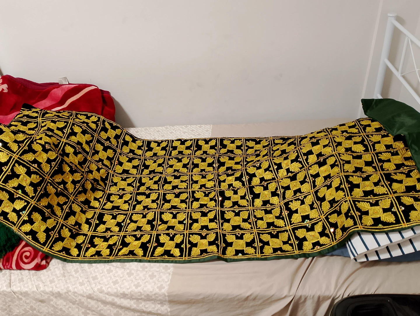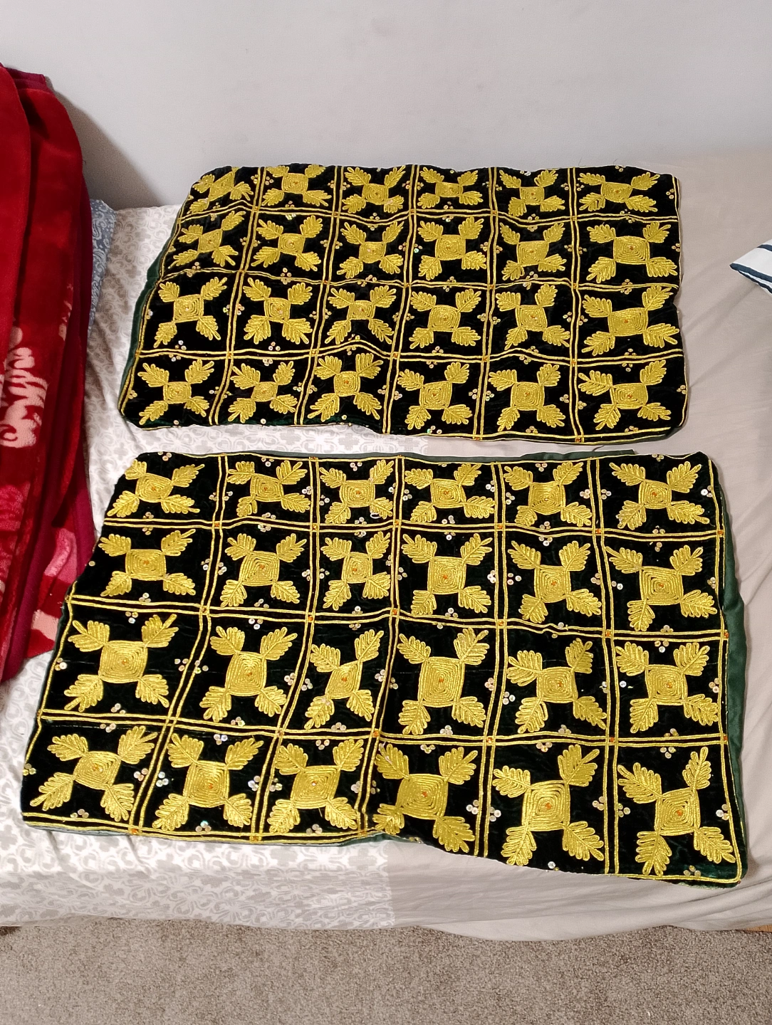 Beautiful Uzbek suzani set. Includes a long decorative textile and two matching pillow covers. with two cushion covers and one thusak cover Intricate gold embroidery on dark green velvet. Unique and traditional design. Perfect for adding a touch of culture to your home.