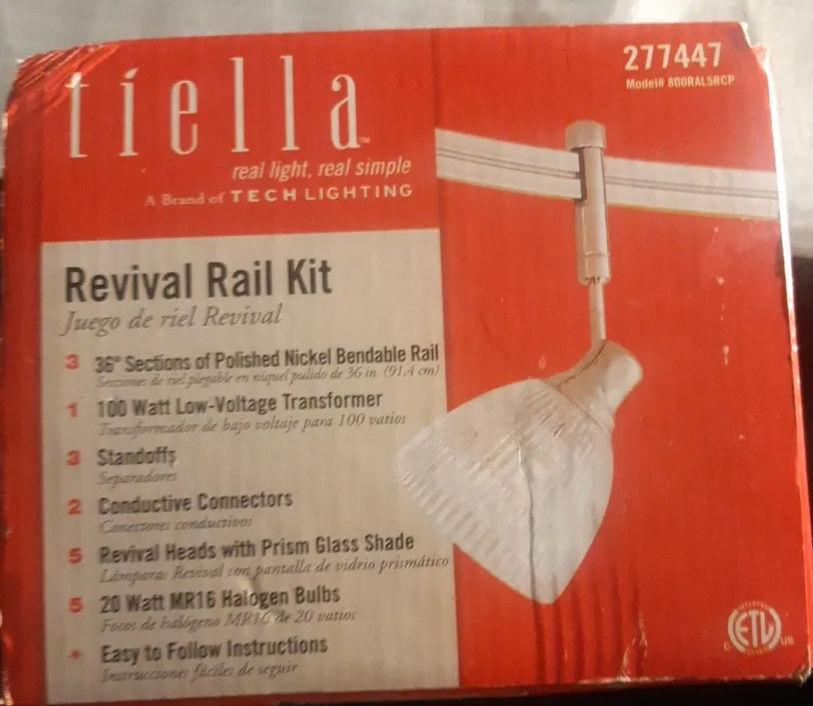 Brand new in box Tieella Revival Rail Kit- 36" Polished Nickel Track Light. Features 36-inch bendable polished nickel rail, low-voltage transformer, and five heads with prism glass shades. Includes 20-watt MR16 halogen bulbs. Easy to follow instructions.