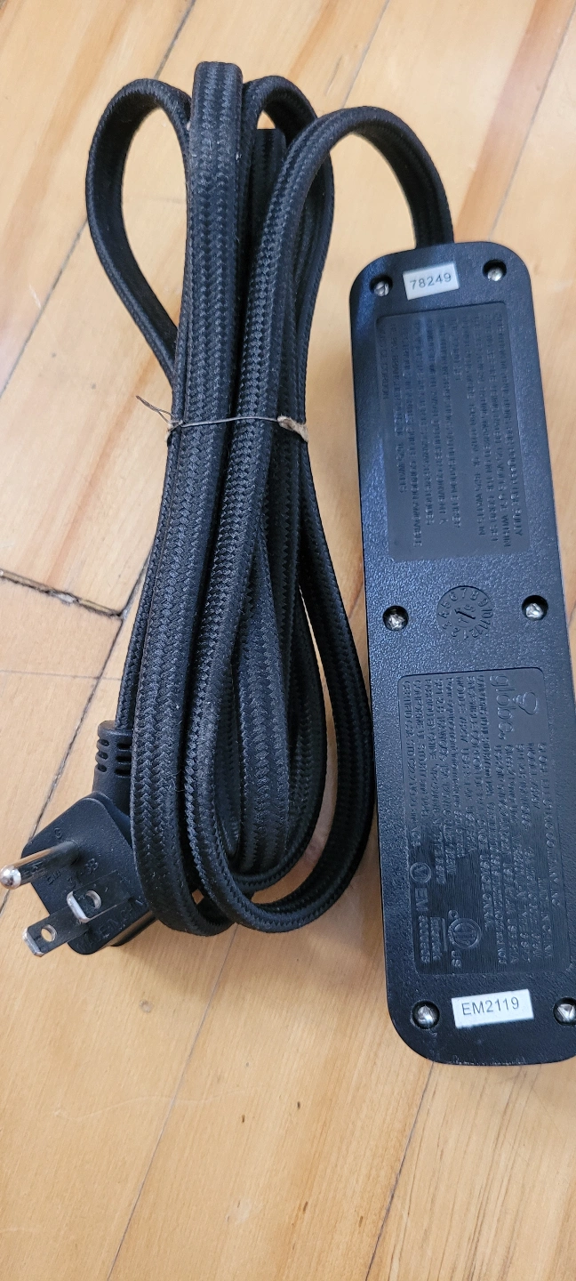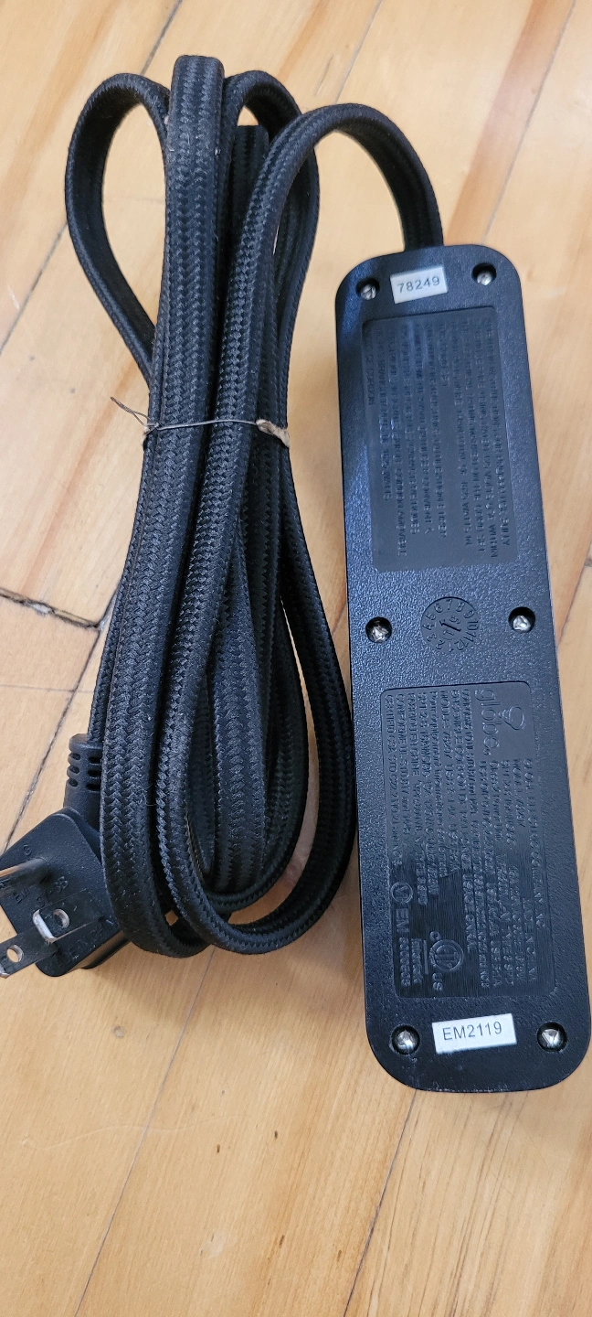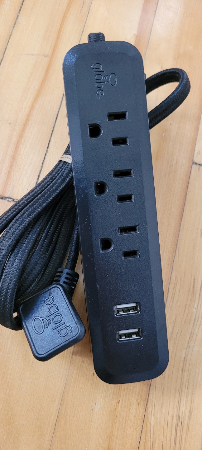 130Black power bar, six outlets and two USB ports. Features a braided black cord. Compact design, ideal for home or office use.
