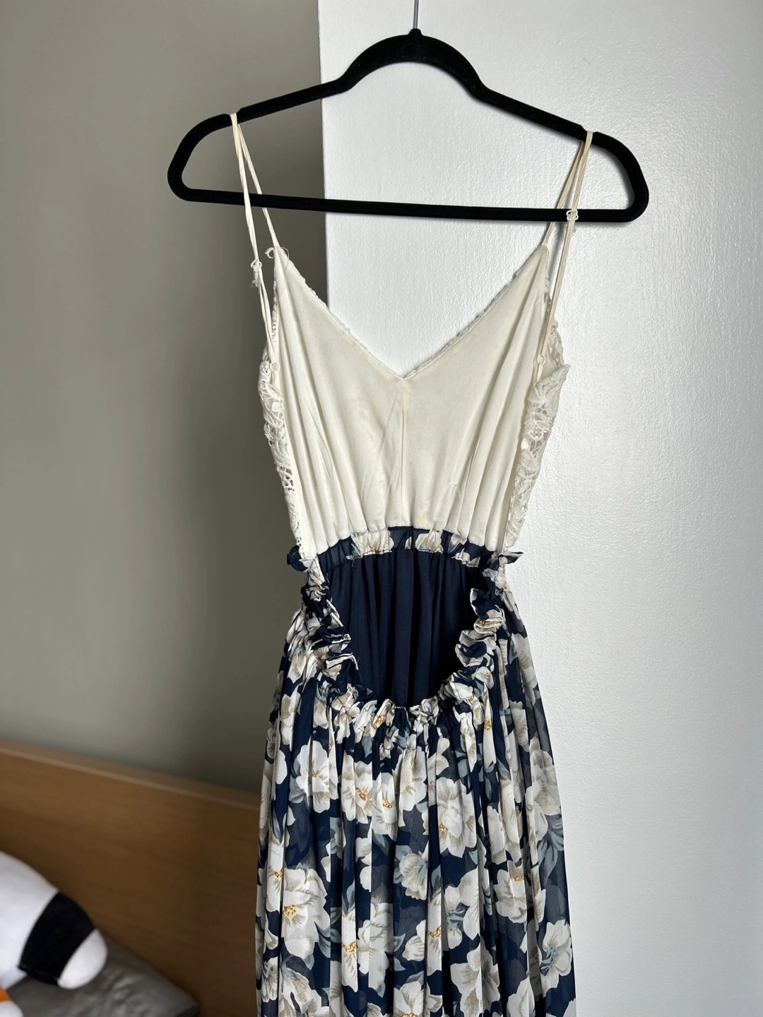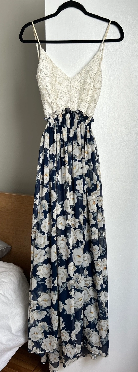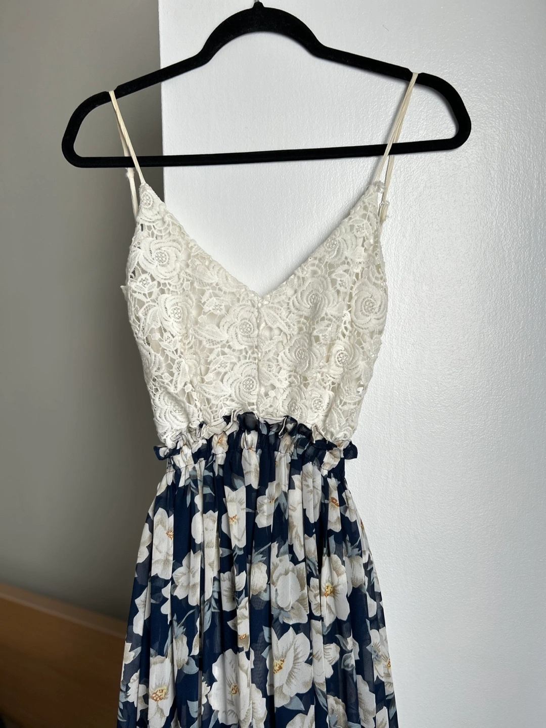 Floral maxi dress. Features a cream lace bodice and a navy floral chiffon skirt. Cut-out back detail. Adjustable straps. Flowy and feminine.