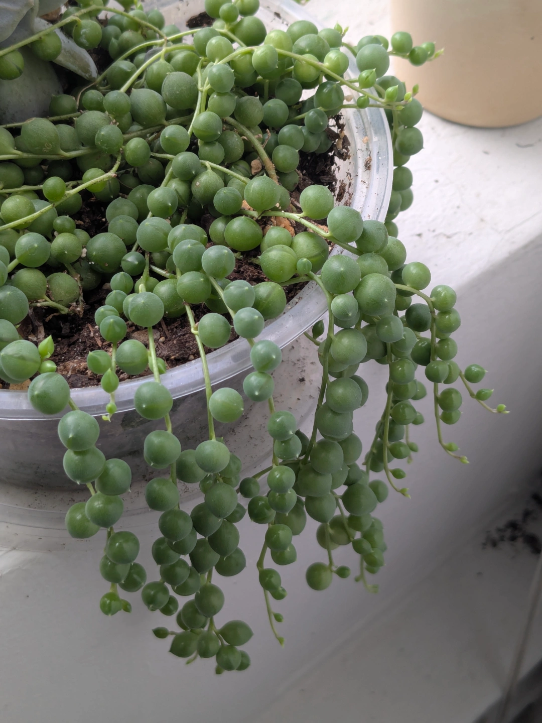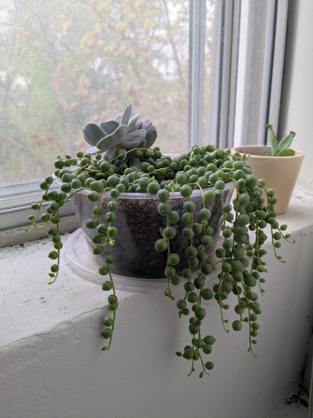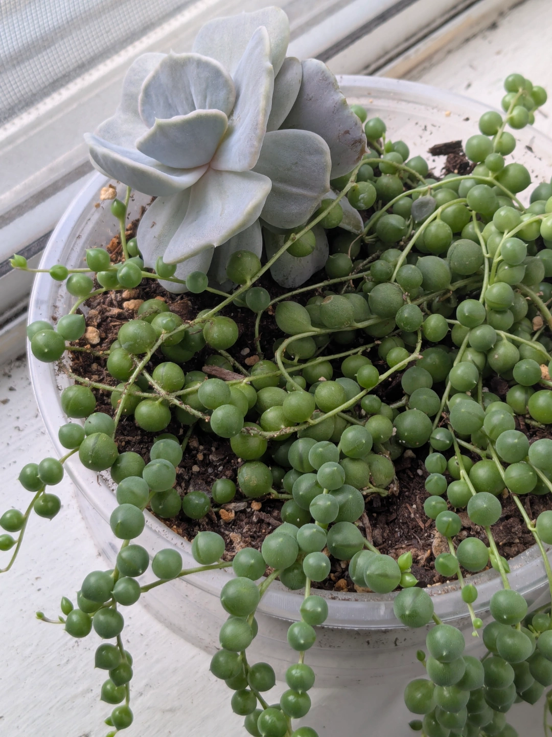 Healthy String of Pearls and Echeveria succulent in a plastic pot. *The plastic pot has holes at the bottom, for drainage.