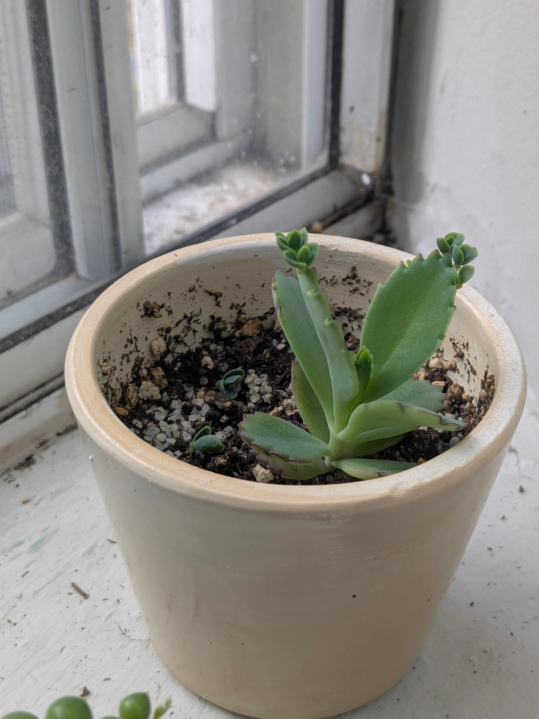 Small Kalanchoe plant in a beige pot.
