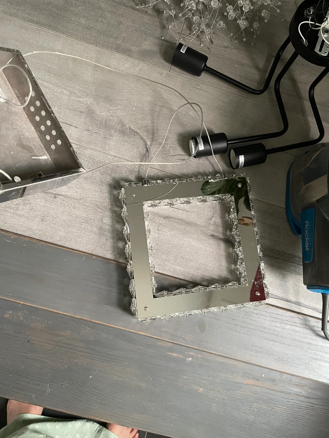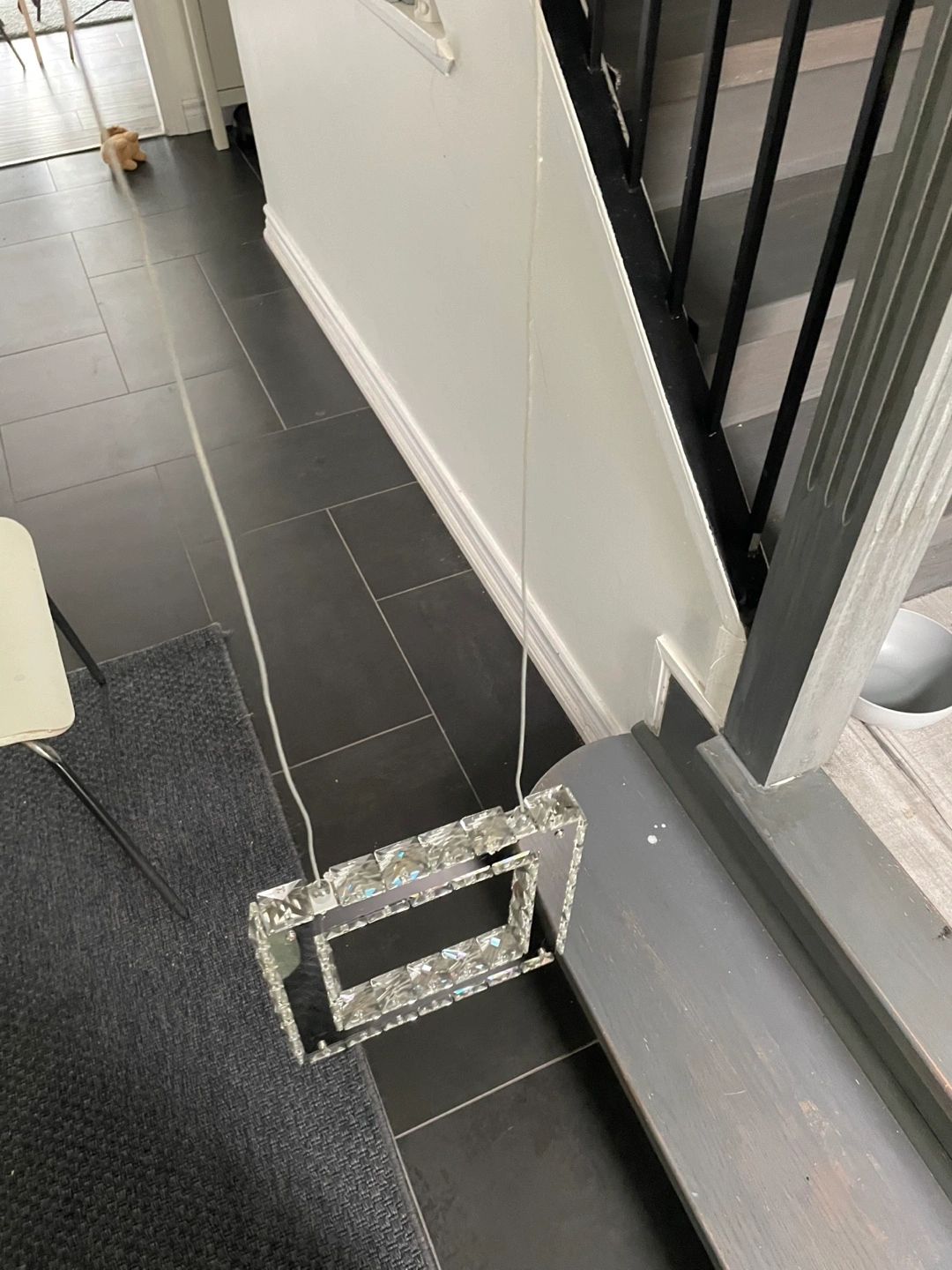 Beautiful square chandelier. Crystal accents. Height adjustable. Requires assembly. Excellent condition. Stunning addition to any room.