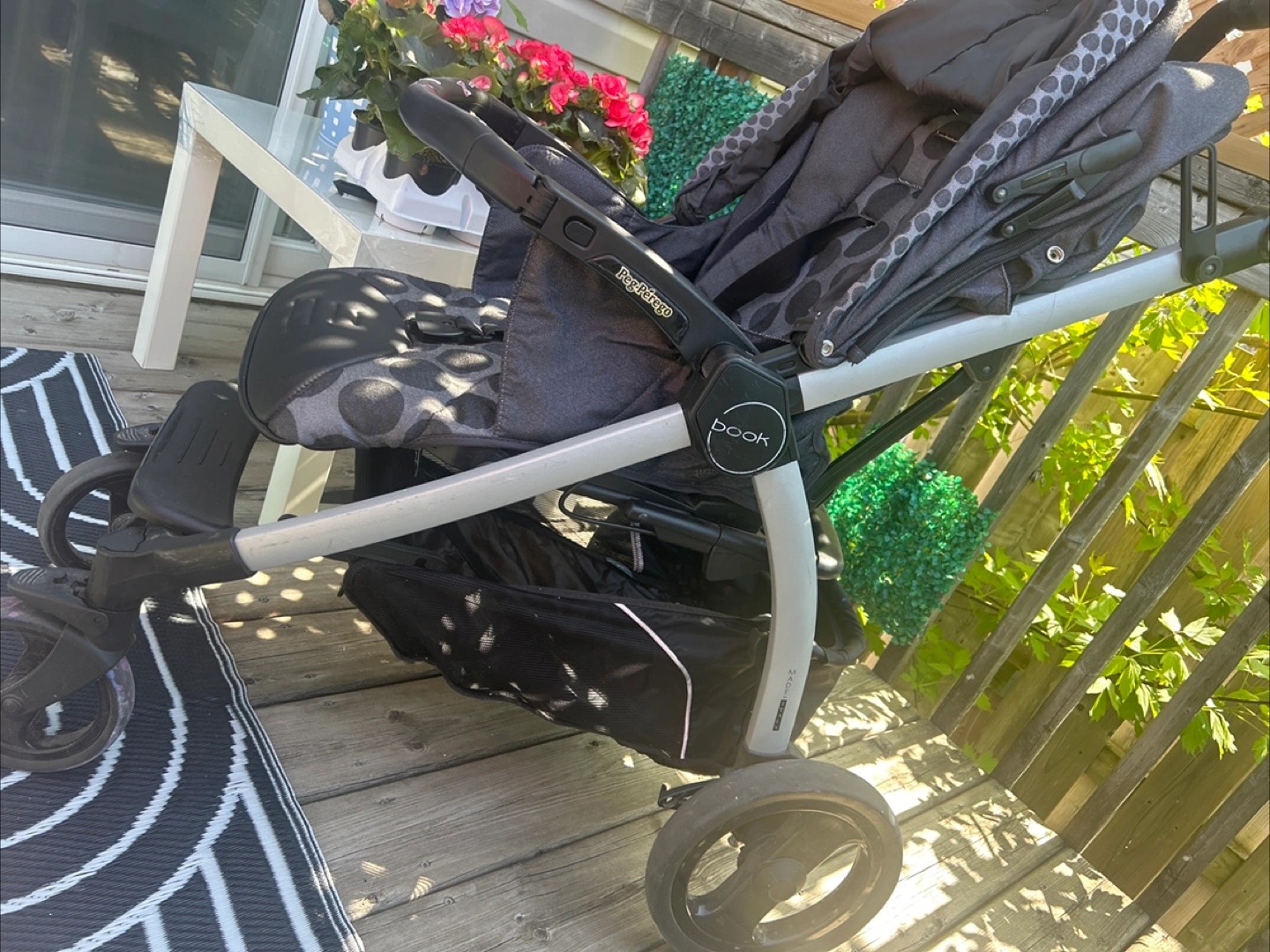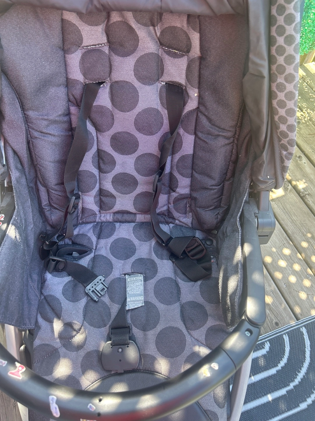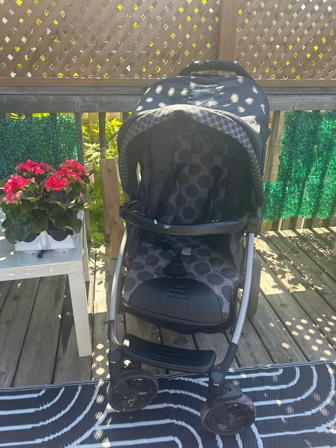 60Lightweight stroller, easy to fold and manoeuvre. Features include adjustable handle, multi-position reclining seat, and large storage basket. Grey and black polka dot pattern.