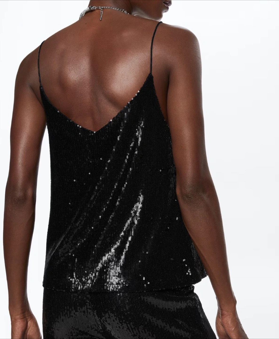 Black sequined camisole. Features delicate sheer straps and a V-neck. Made of soft, comfortable material. Perfect for a night out.