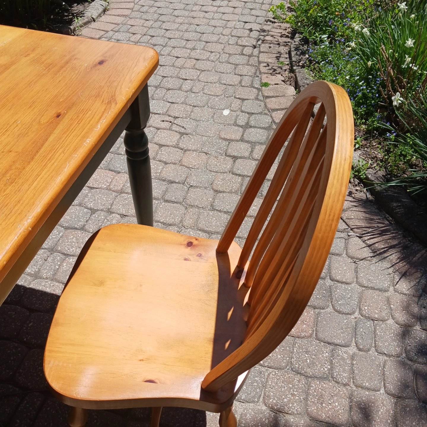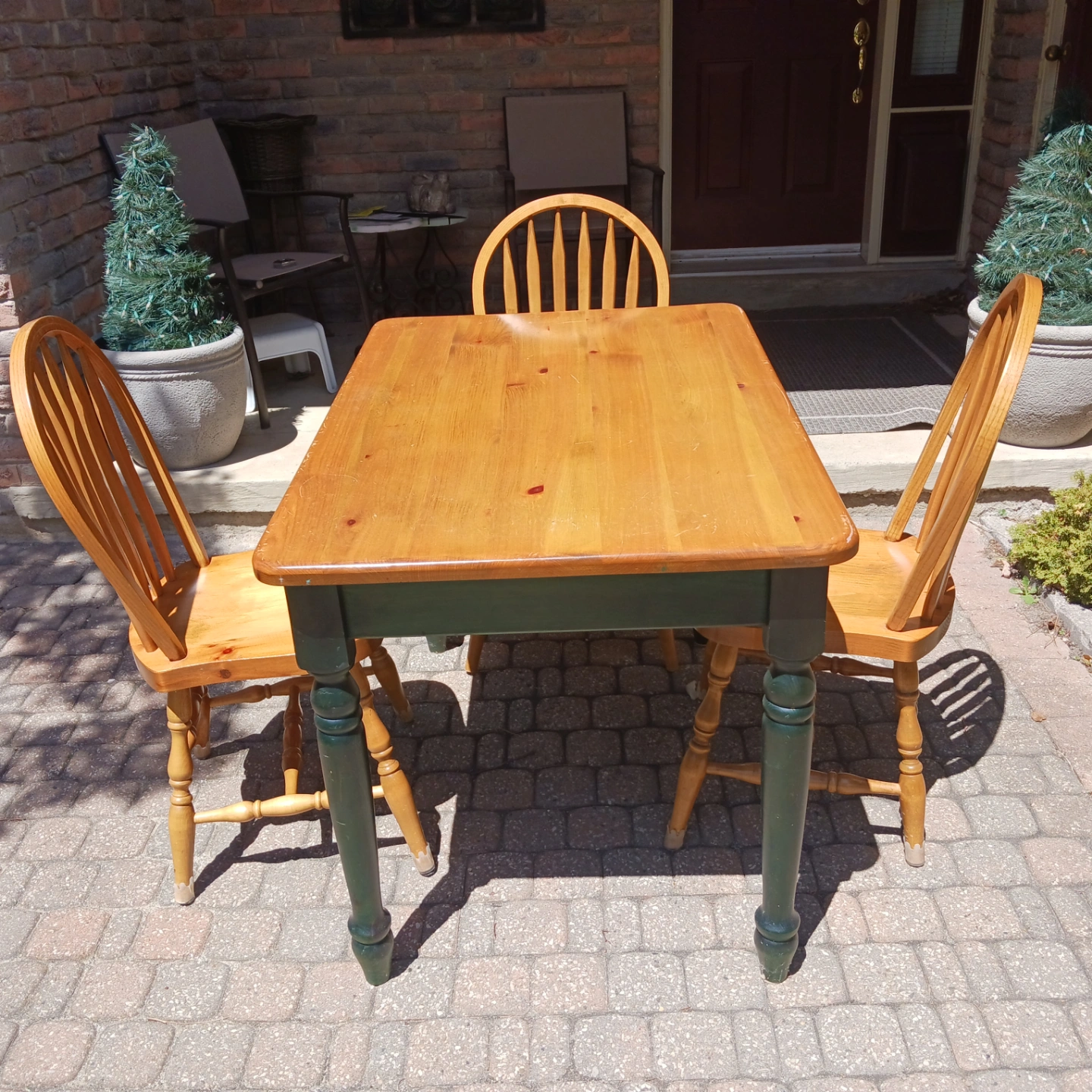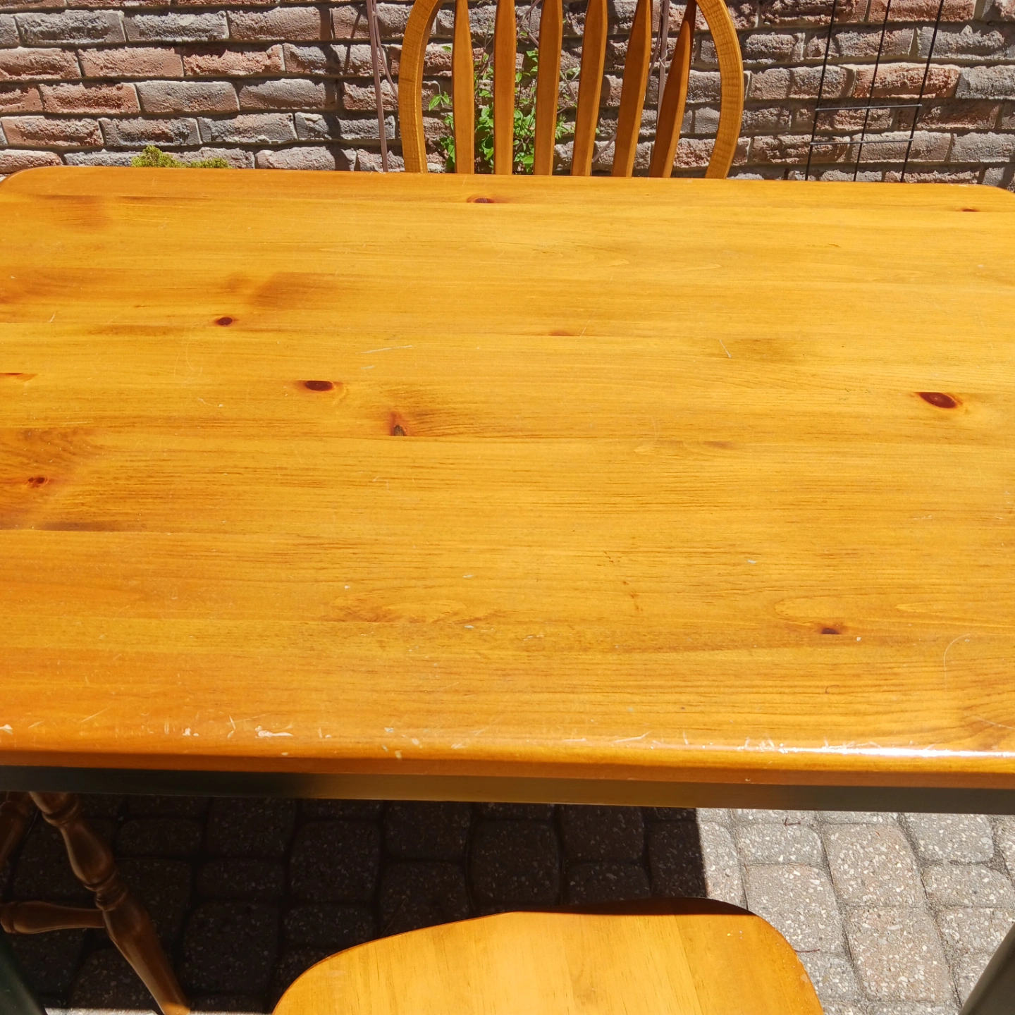 Pine kitchen table and three matching kitchen chairs. Some scratches on the table but otherwise good condition. Chairs in good condition.
