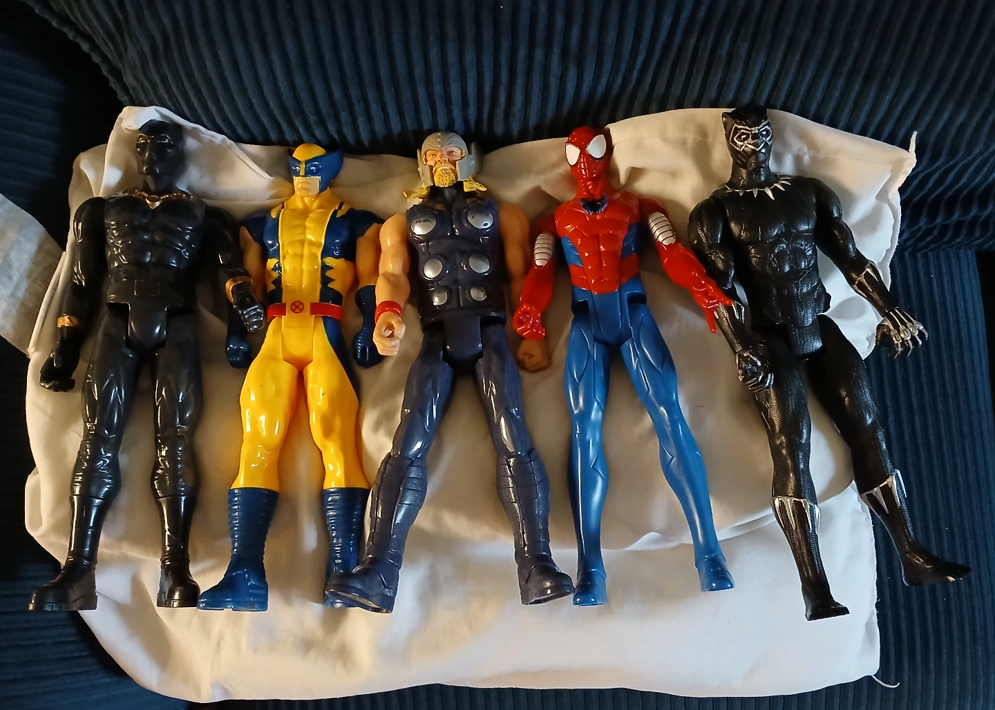 Large lot of Marvel superhero action figures. Includes Thor, Spiderman, Captain America, Wolverine, and two Black Panthers. Also included is a Bat mobile and Special Force tank toys. Figures are approximately 12 inches tall. Some minor wear and tear.