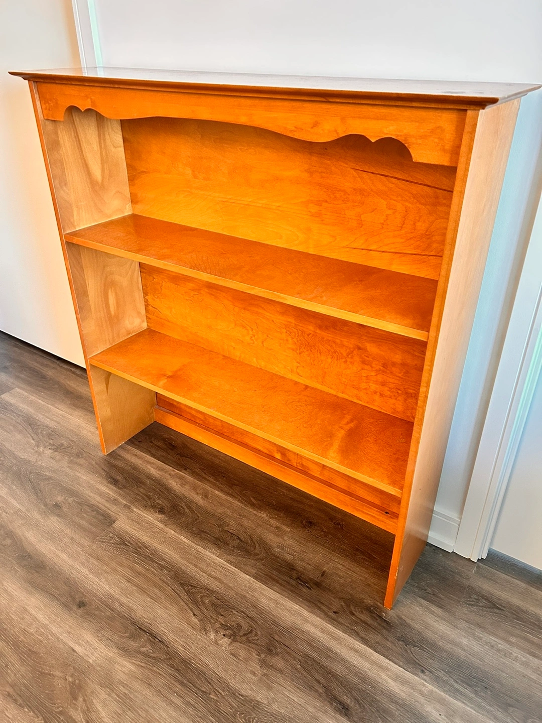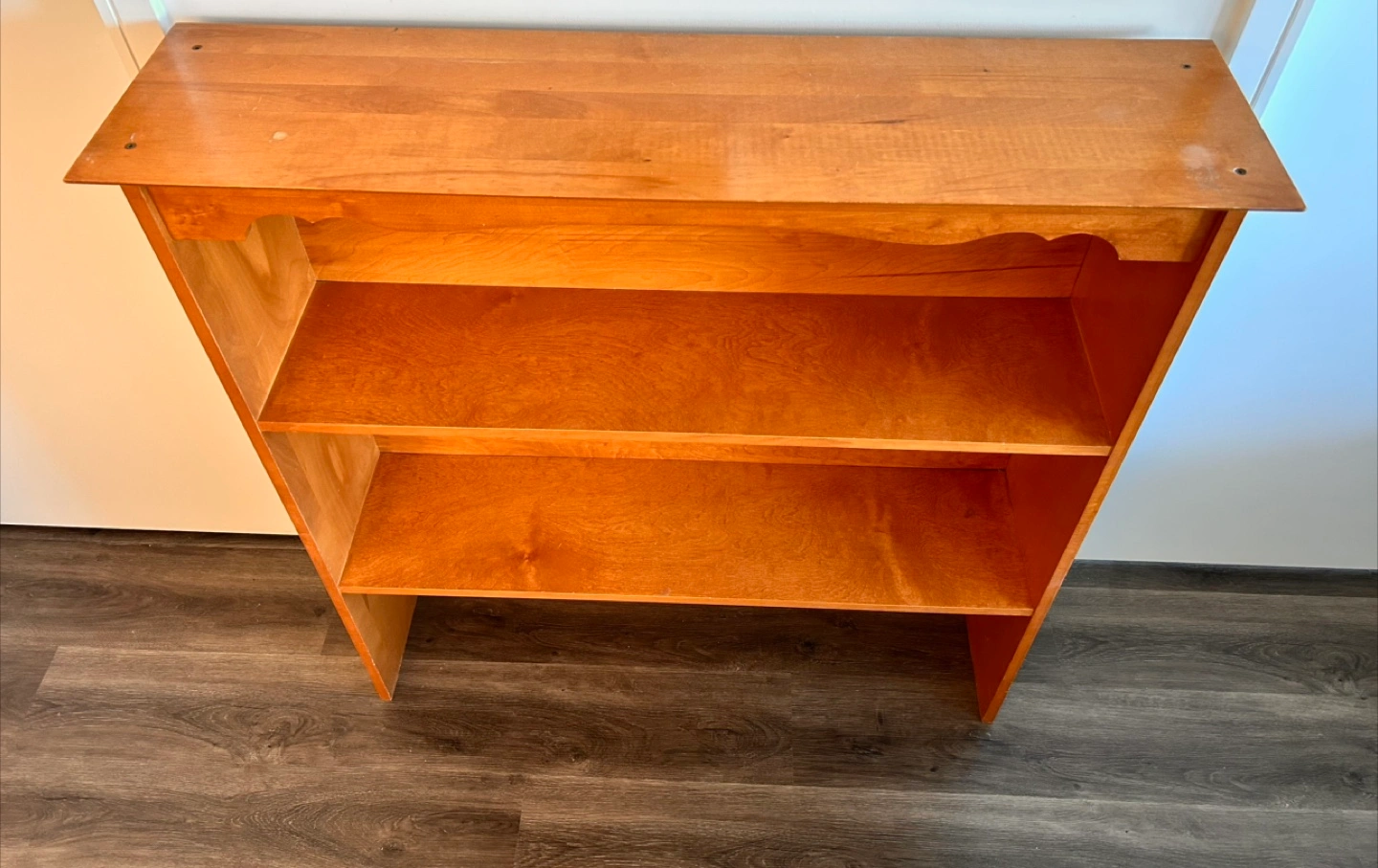 Solid wood bookcase. Two shelves. Nice colour. Good for books or display items. Slight wear, but overall in good condition.