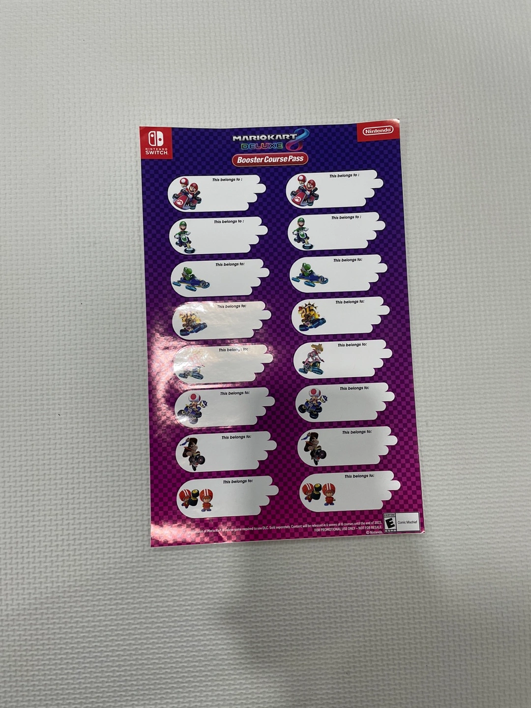 Unused Mario Kart 8 Deluxe Booster Course Pass character tracker sheet. Features spaces to write names next to each character.