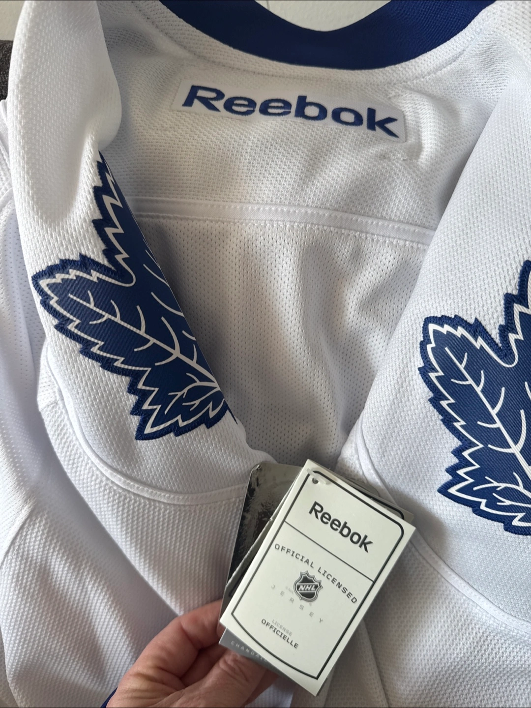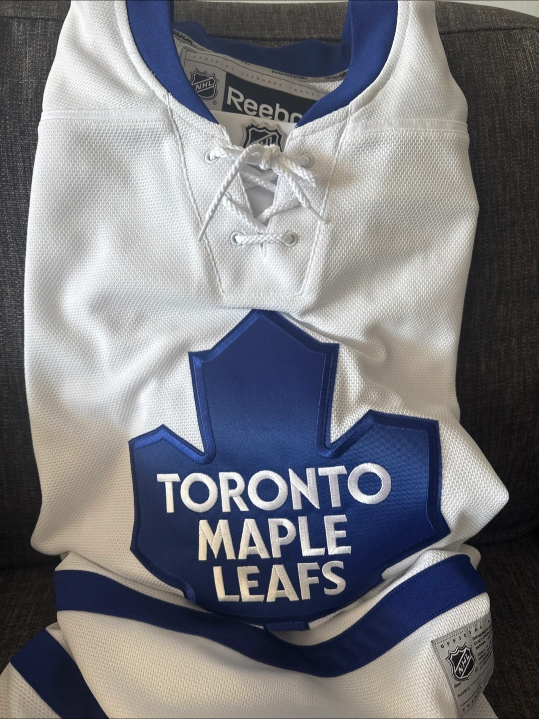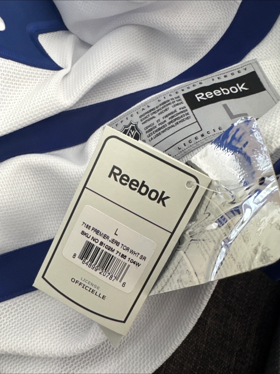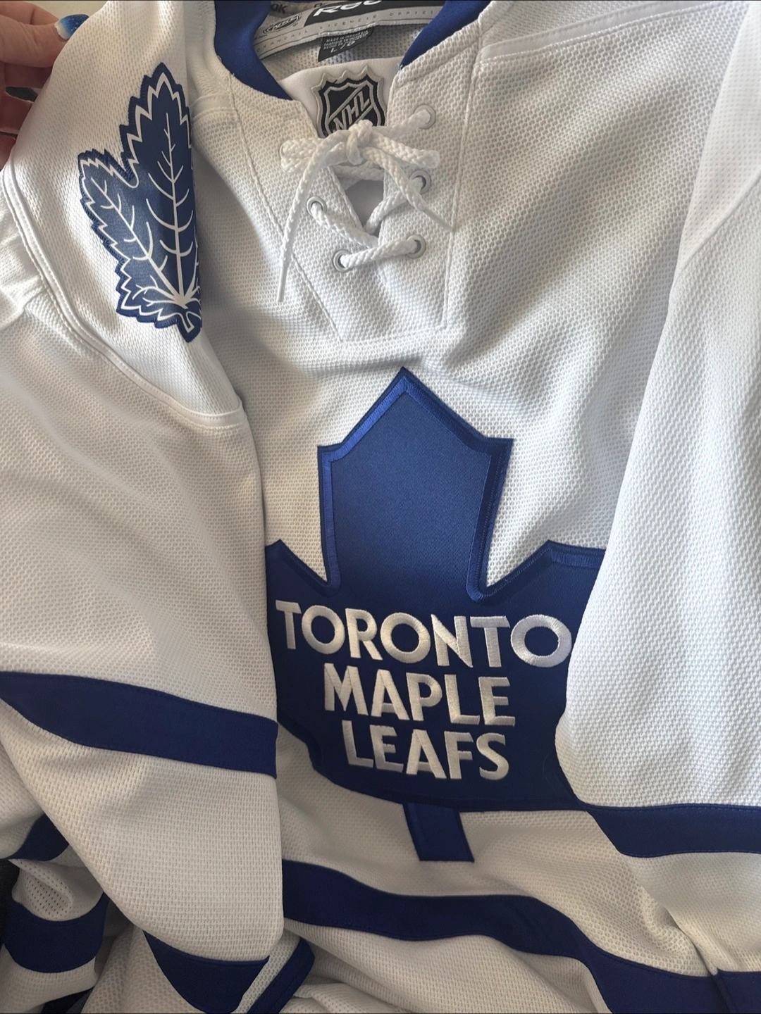 Men's Toronto Maple Leafs hockey jersey. White with blue accents. Reebok brand. Size large. Officially licensed NHL apparel.