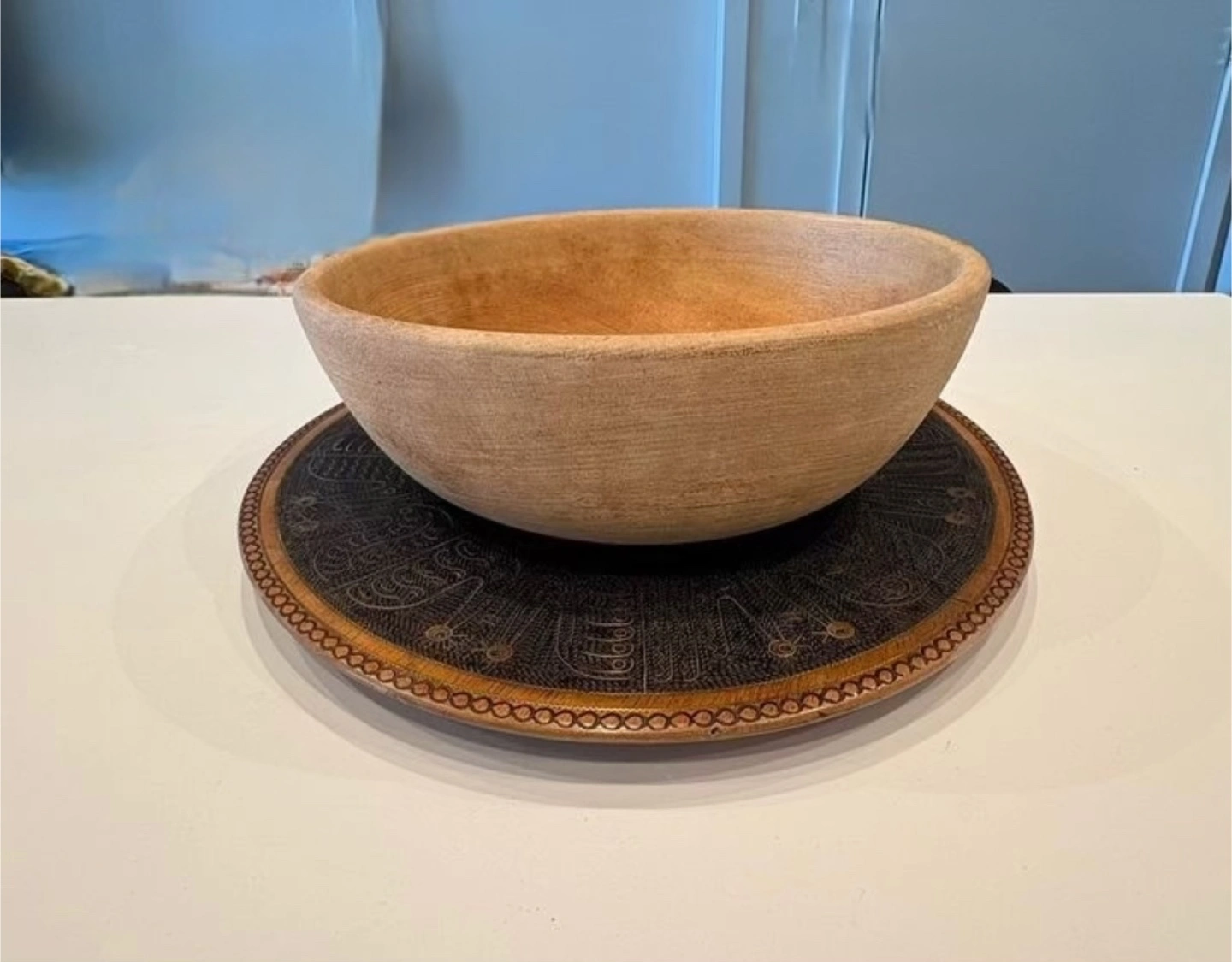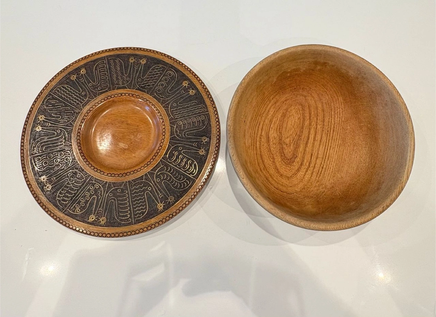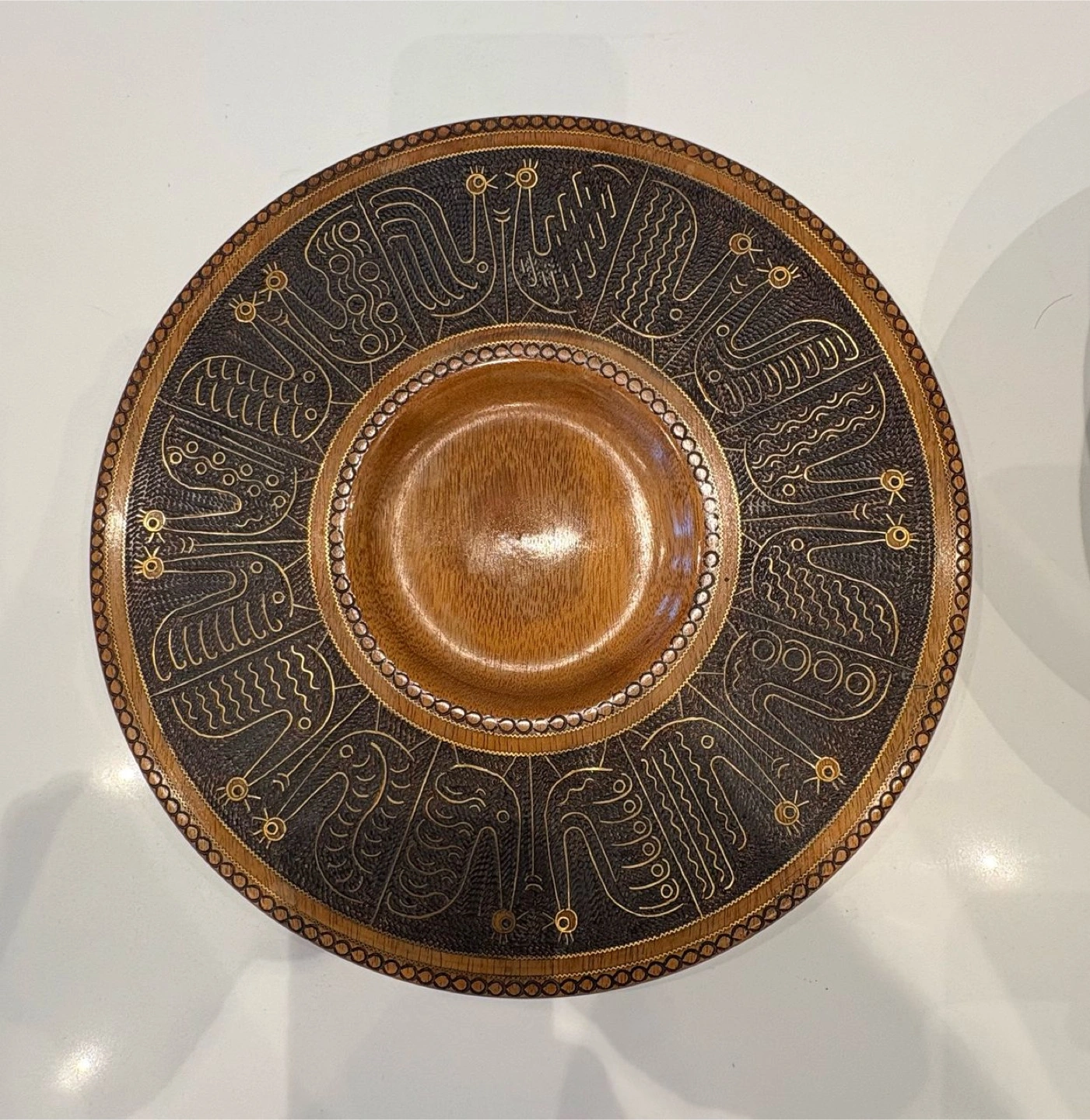 Beautiful set, includes a large wooden bowl and a decorative platter. Intricate bird designs adorn the platter. Perfect for serving or as a decorative centerpiece.