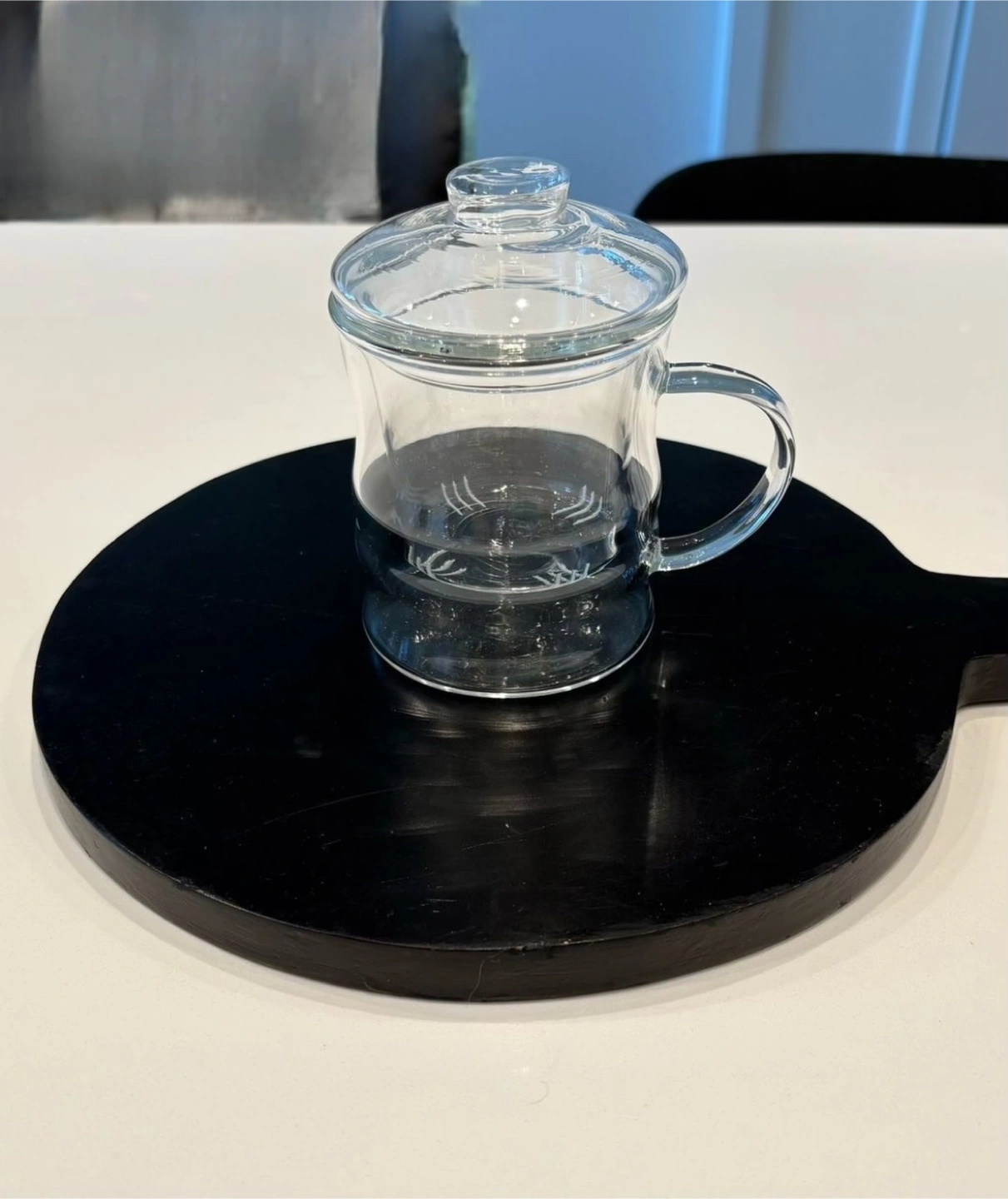 Lovely glass tea cup set. Includes a small glass for steeping tea and a lid. A black serving board is included. Perfect for tea lovers.