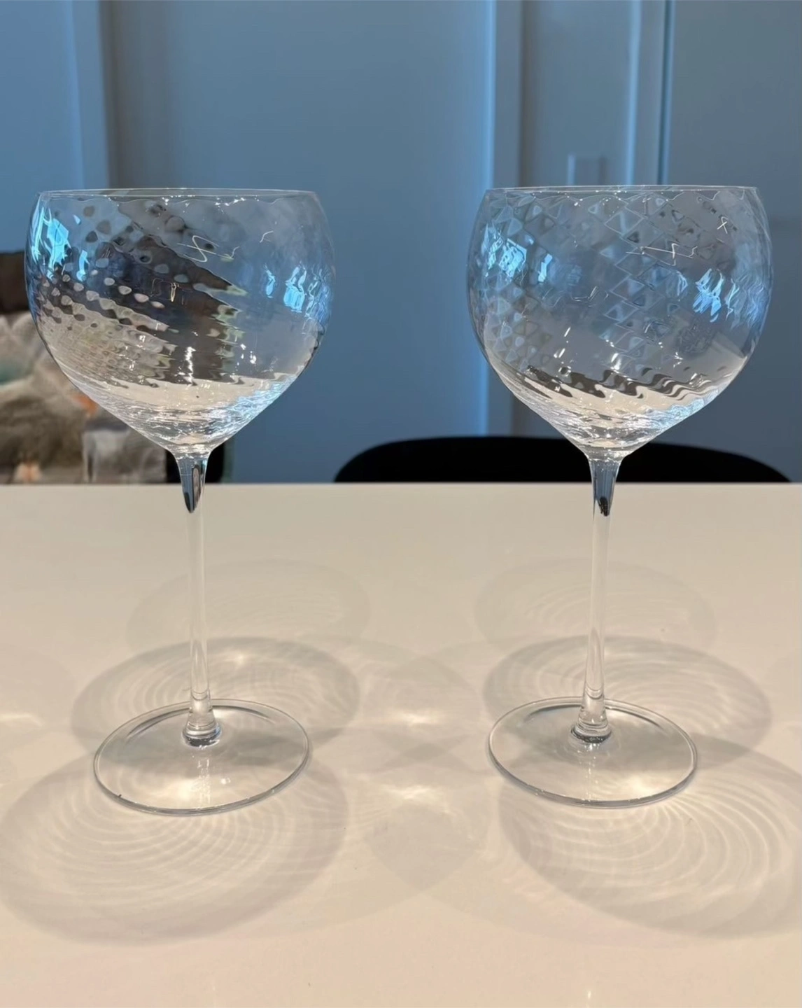 Beautiful set of 6 wine glasses. Unique design. Clear glass. Long stems. Perfect for entertaining. Never used