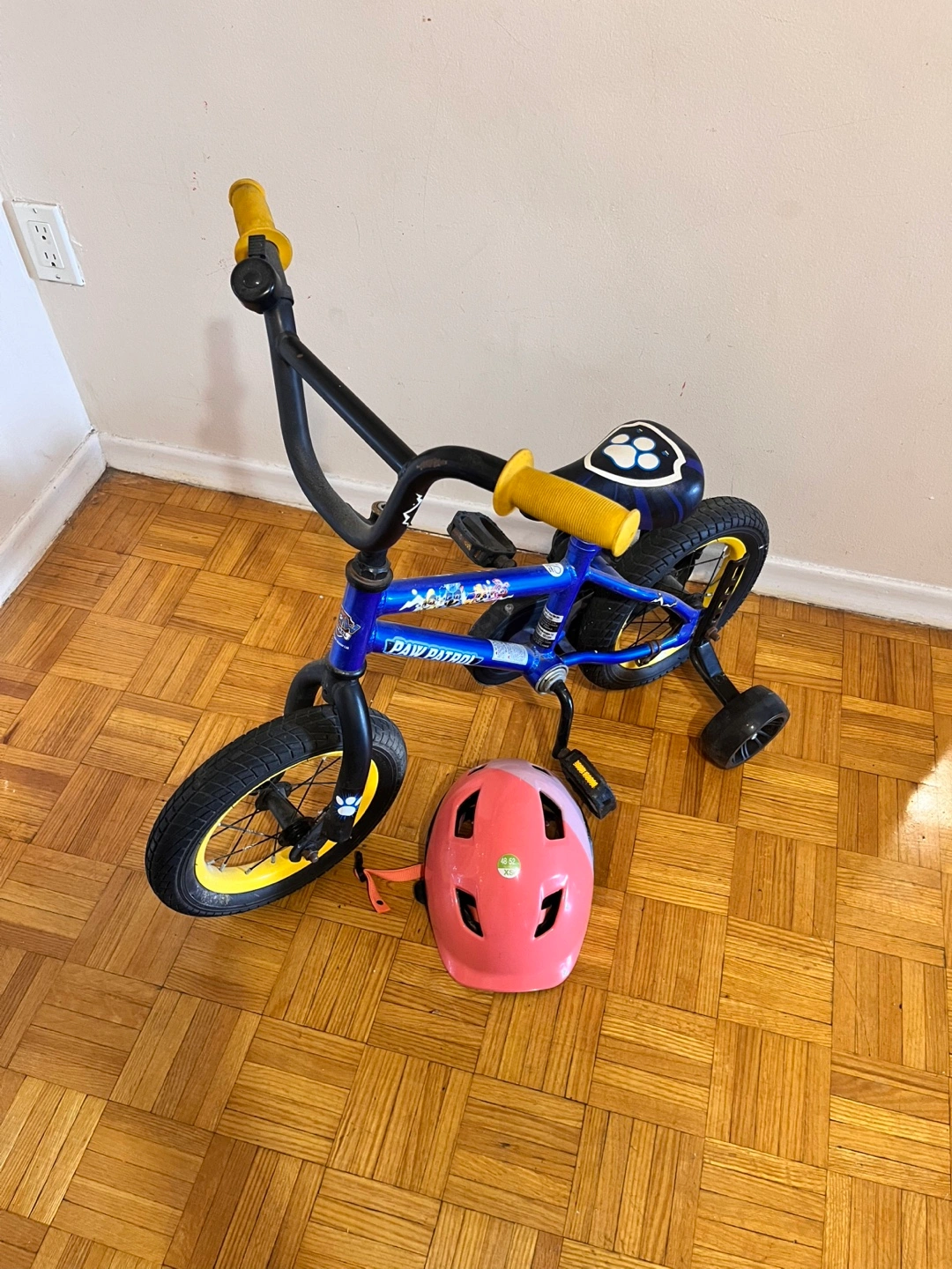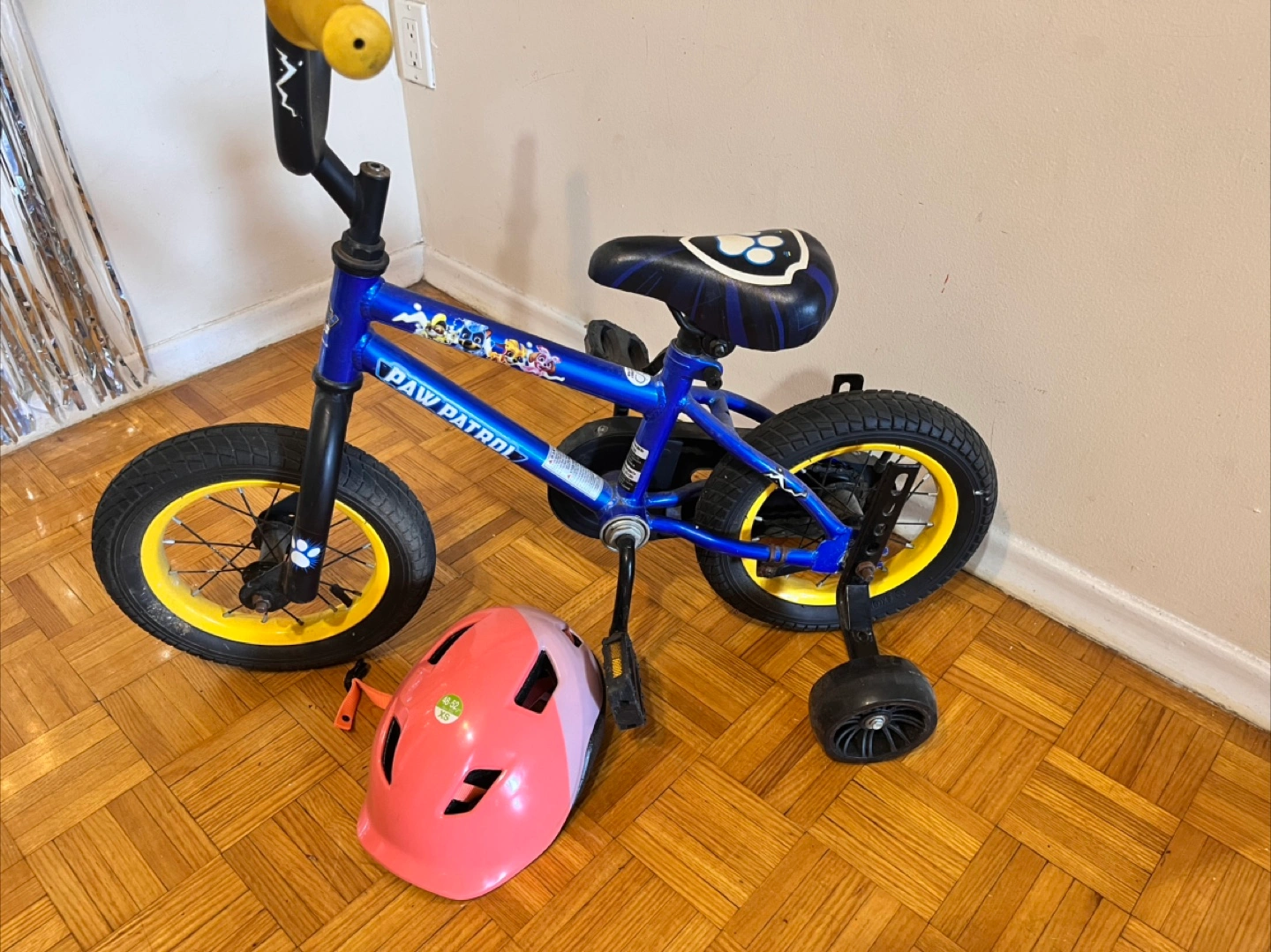 Move out sale ! Blue Paw Patrol-themed bike with training wheels. Includes pink helmet. Great for young children.