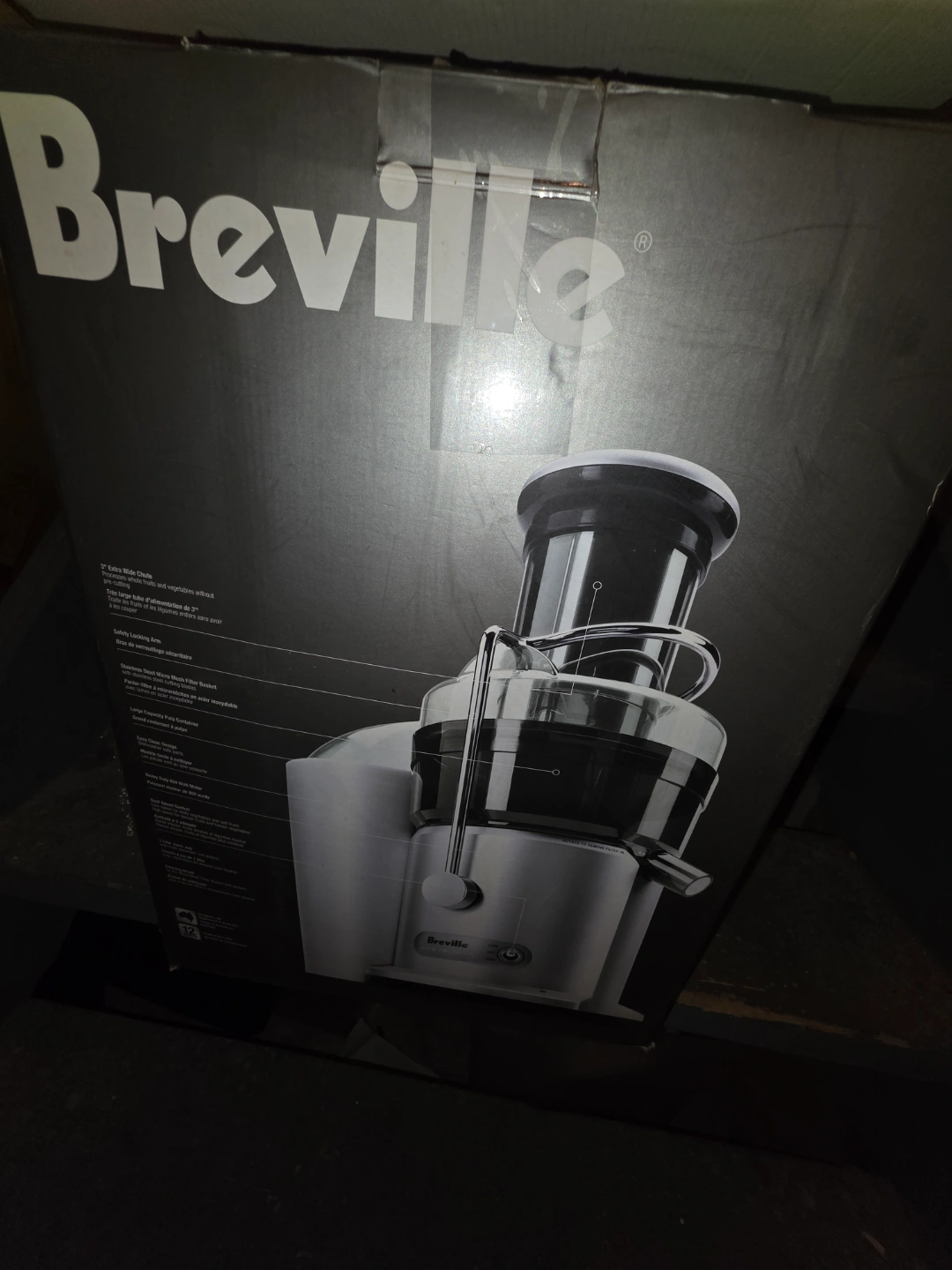 Breville cold press juicer. Features a 3" extra-wide chute. Stainless steel micromesh filter basket. Large capacity pulp container. Low speed juicing. Safety locking arm.