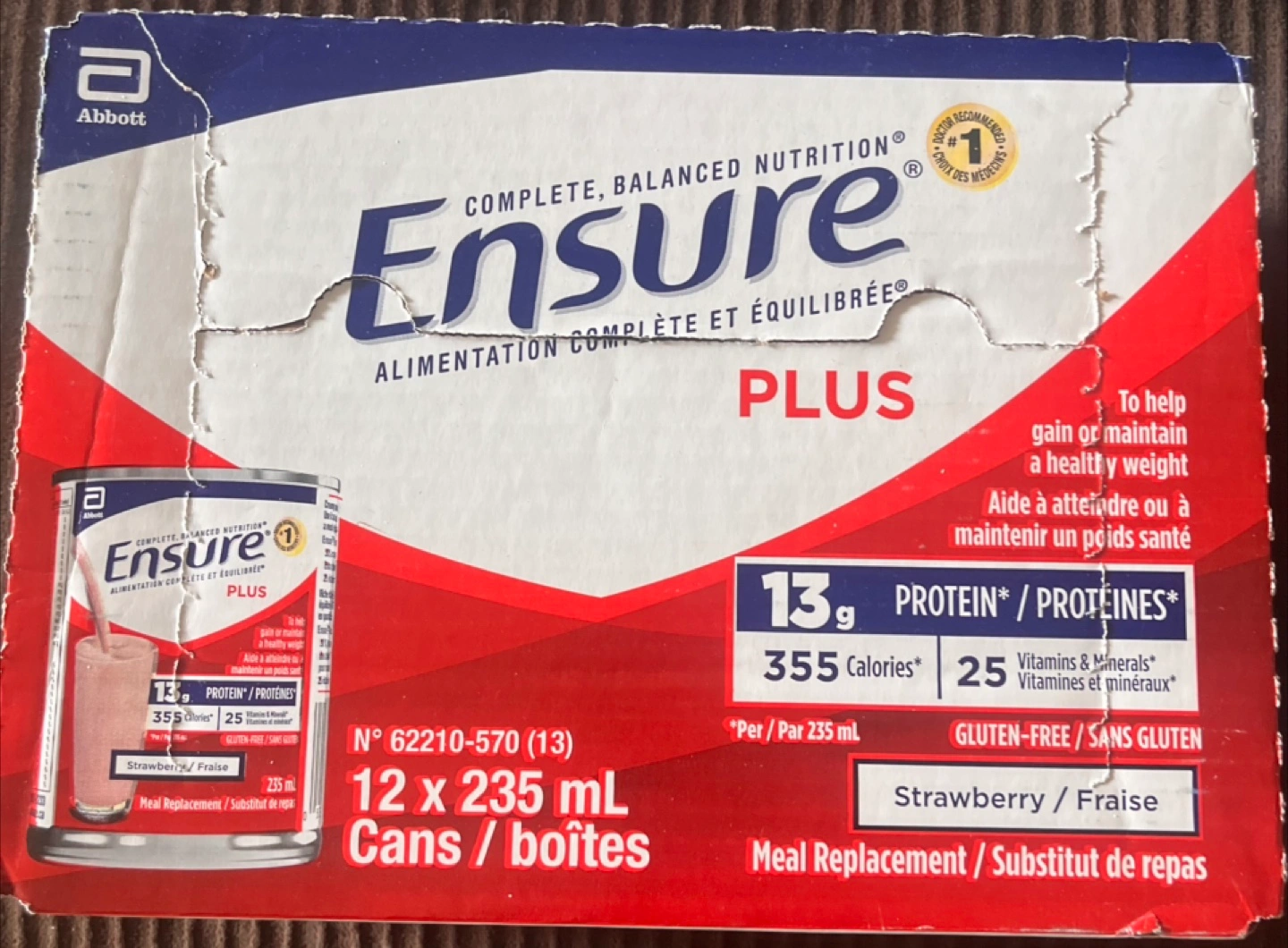12 cans of strawberry Ensure Plus meal replacement shakes. Gluten-free. Provides 13g protein and 355 calories per can. Expiry Dec 1, 2025