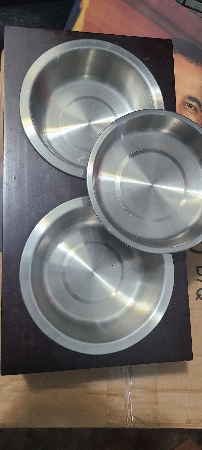 Double-dish elevated pet feeder. Dark brown wood frame. Three stainless steel bowls included. Great for cats or small dogs. GET a FREE 8 pound bag of Skoon All Natural Cat Litter FREE with purchase.