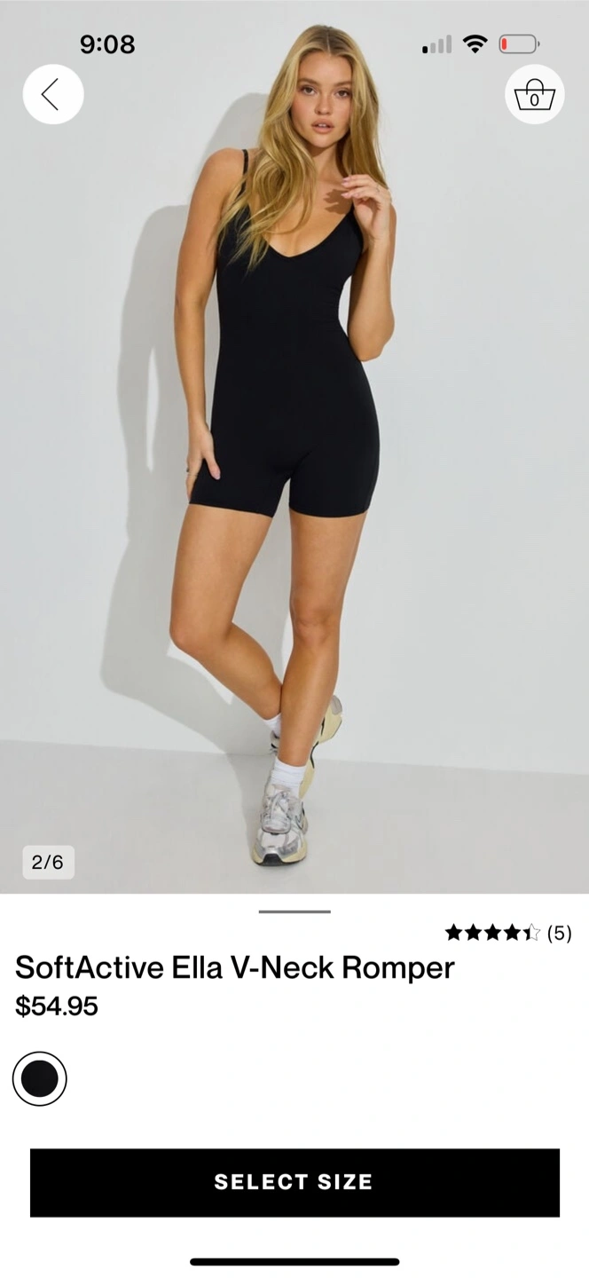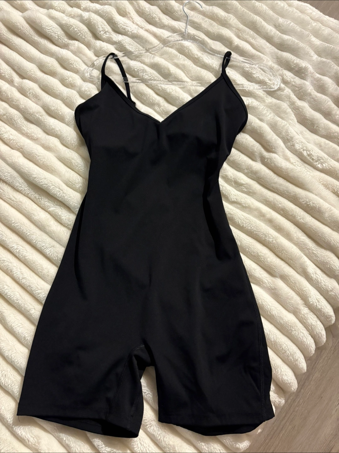 Black romper, V-neck, spaghetti straps, open back detail. Made of 75% nylon and 25% spandex. Size medium.