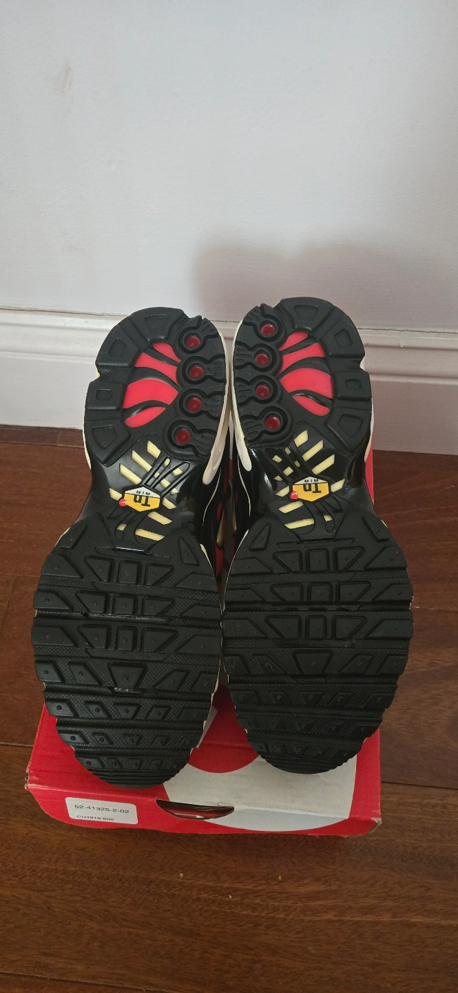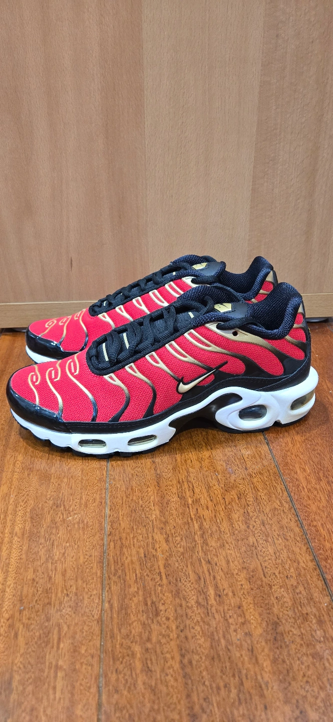 Nike Air Max Plus shoes. Size 6. Red, black, and gold color scheme. New in box.