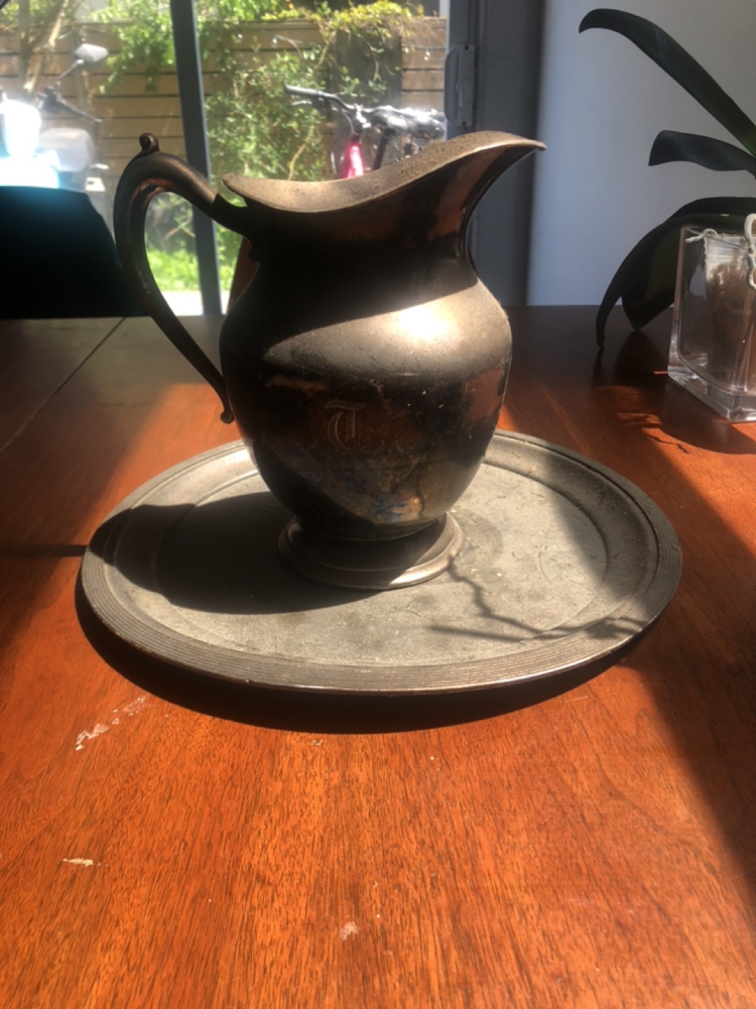 1 / 31 / 3Buy & SellVintage Rogers Bros Silver and Copper Pitcher and TrayVintage Rogers Bros Silver and Copper Pitcher and Tray$50Antique silver plated solid copper pitcher and matching tray. Beautiful patina. Excellent for display or serving. Shows some signs of age and wear.WHERE TO MEETCheck LocationView MapSELLERverifiedOscarLittle Italy18010 reviews0 chats·0 favorites·14 viewsSEND CHAT TO SELLERHi Oscar! I’m interested in your listing.Hi Oscar! I’m interested in your listing.Get the Karrot app to chatSign In to chat