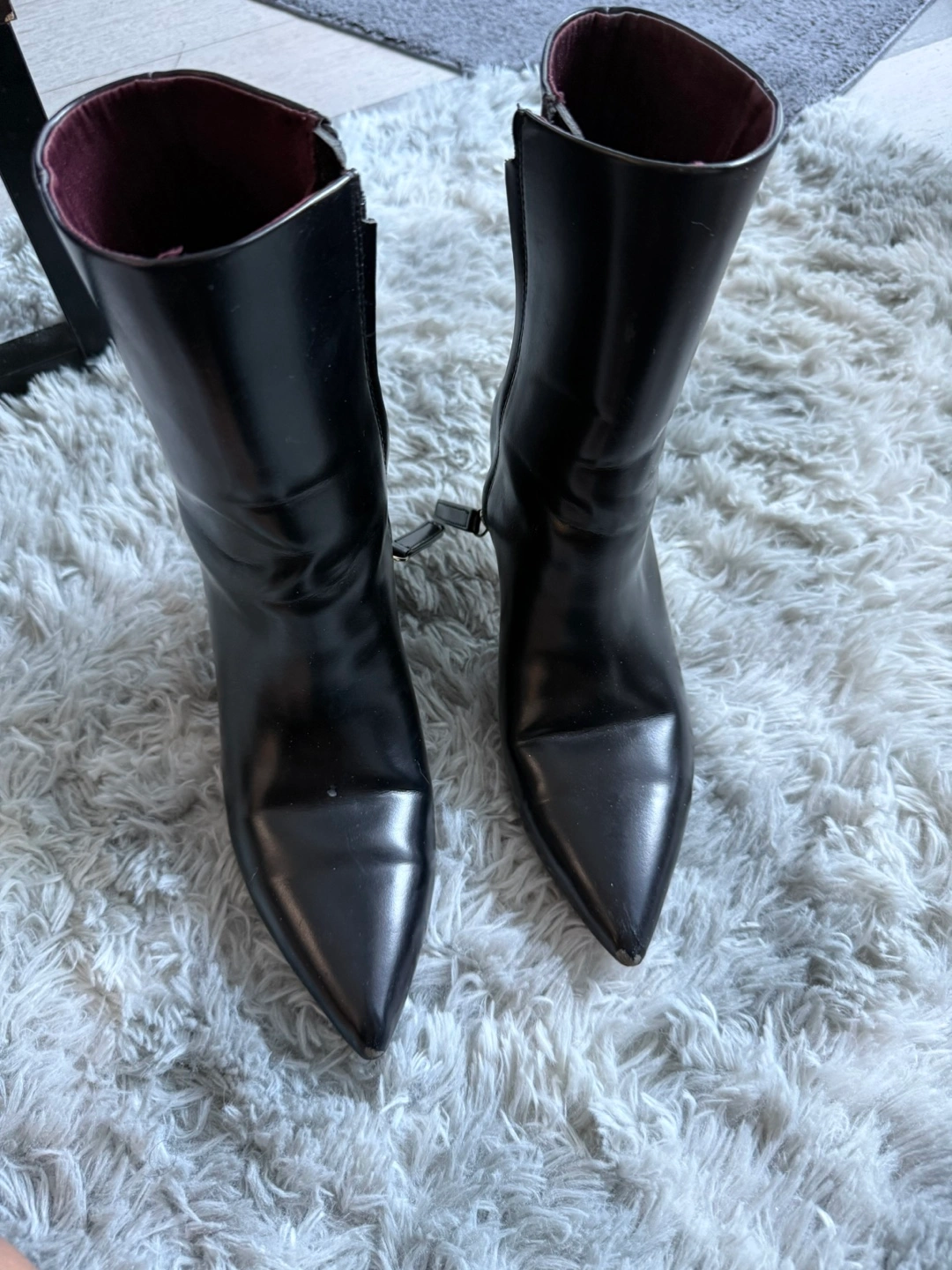 Women's black leather ankle boots. Pointed toes and low heels. Zip closure.