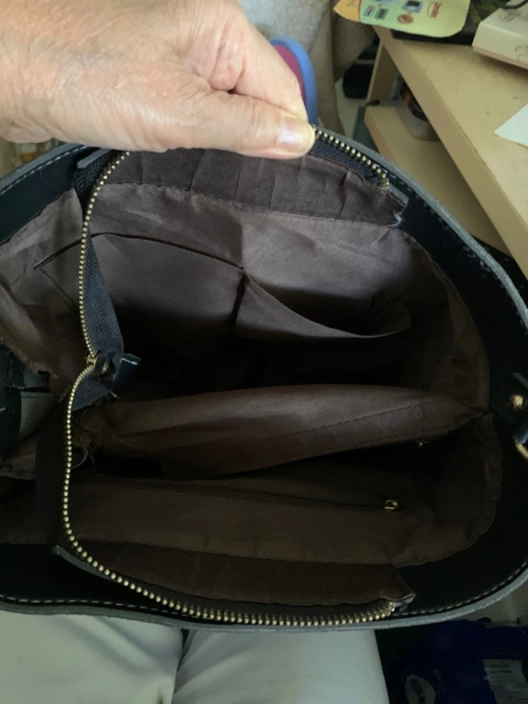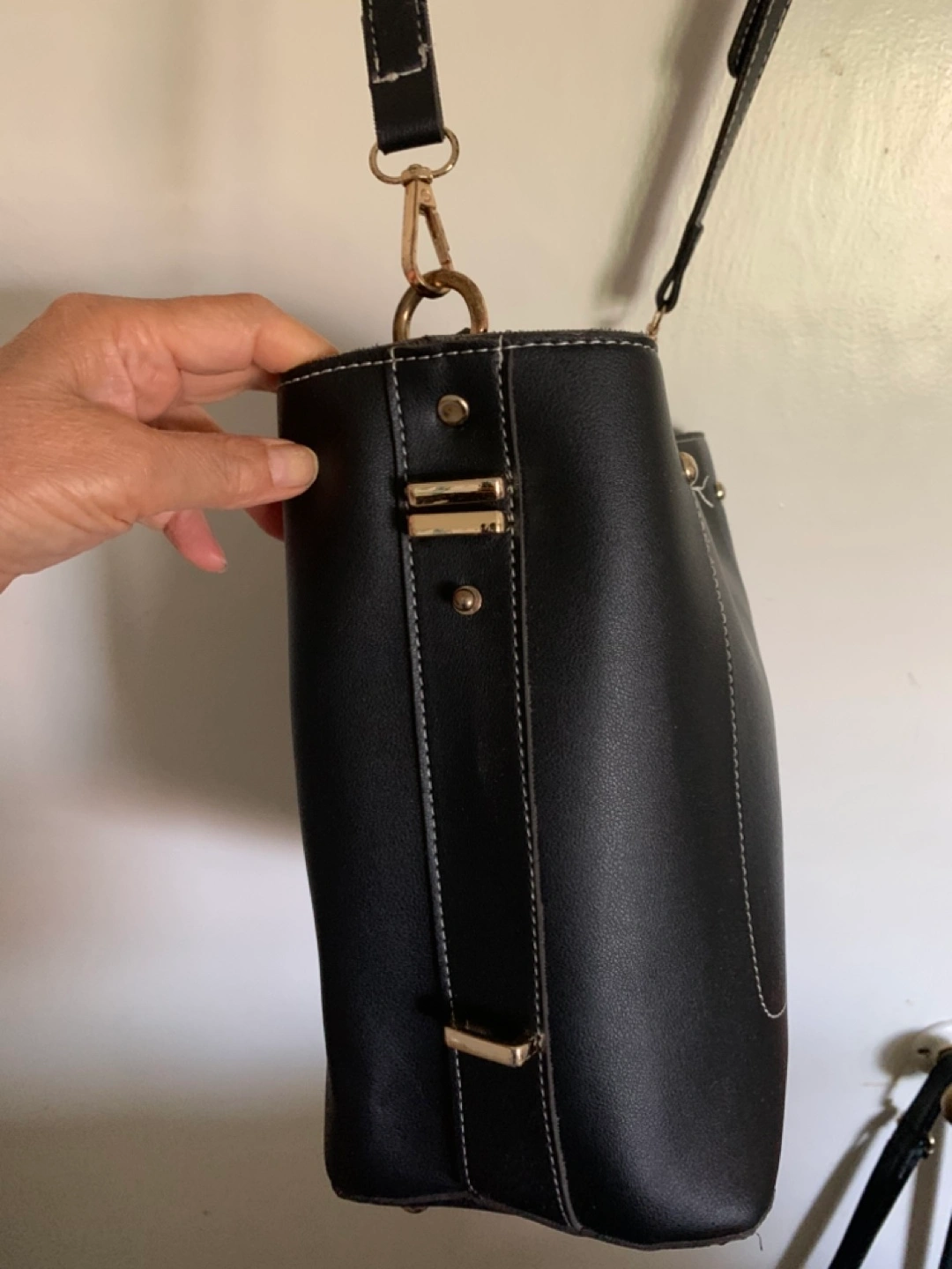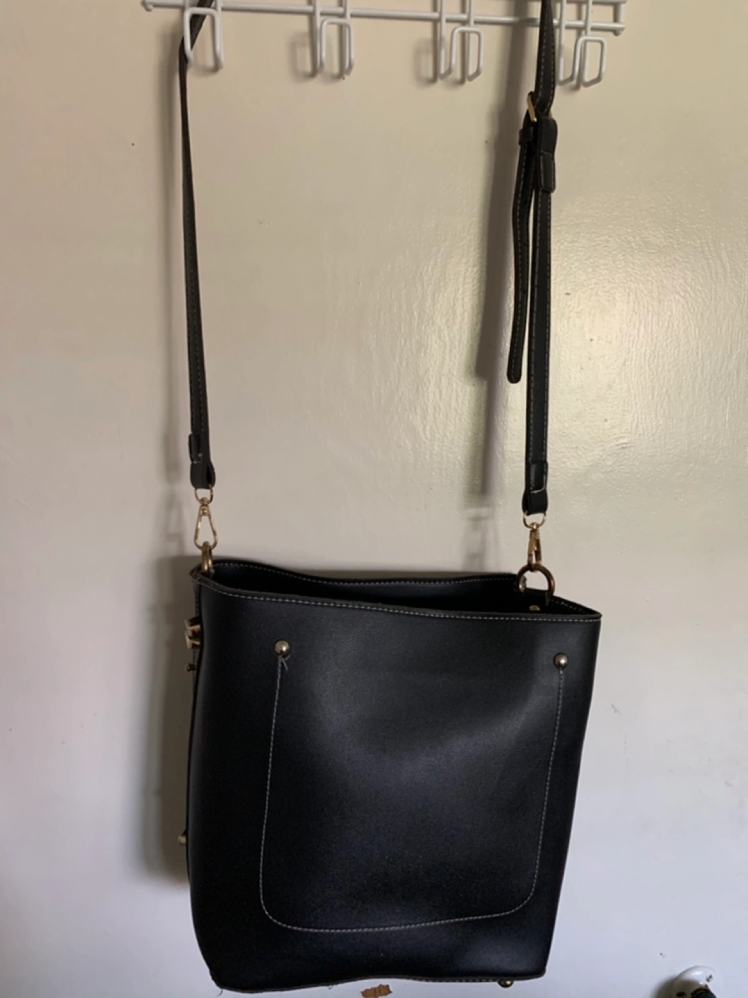 Black faux leather bucket bag. Features gold-toned hardware, multiple interior pockets, and an adjustable shoulder strap. Roomy main compartment. Perfect everyday bag.
