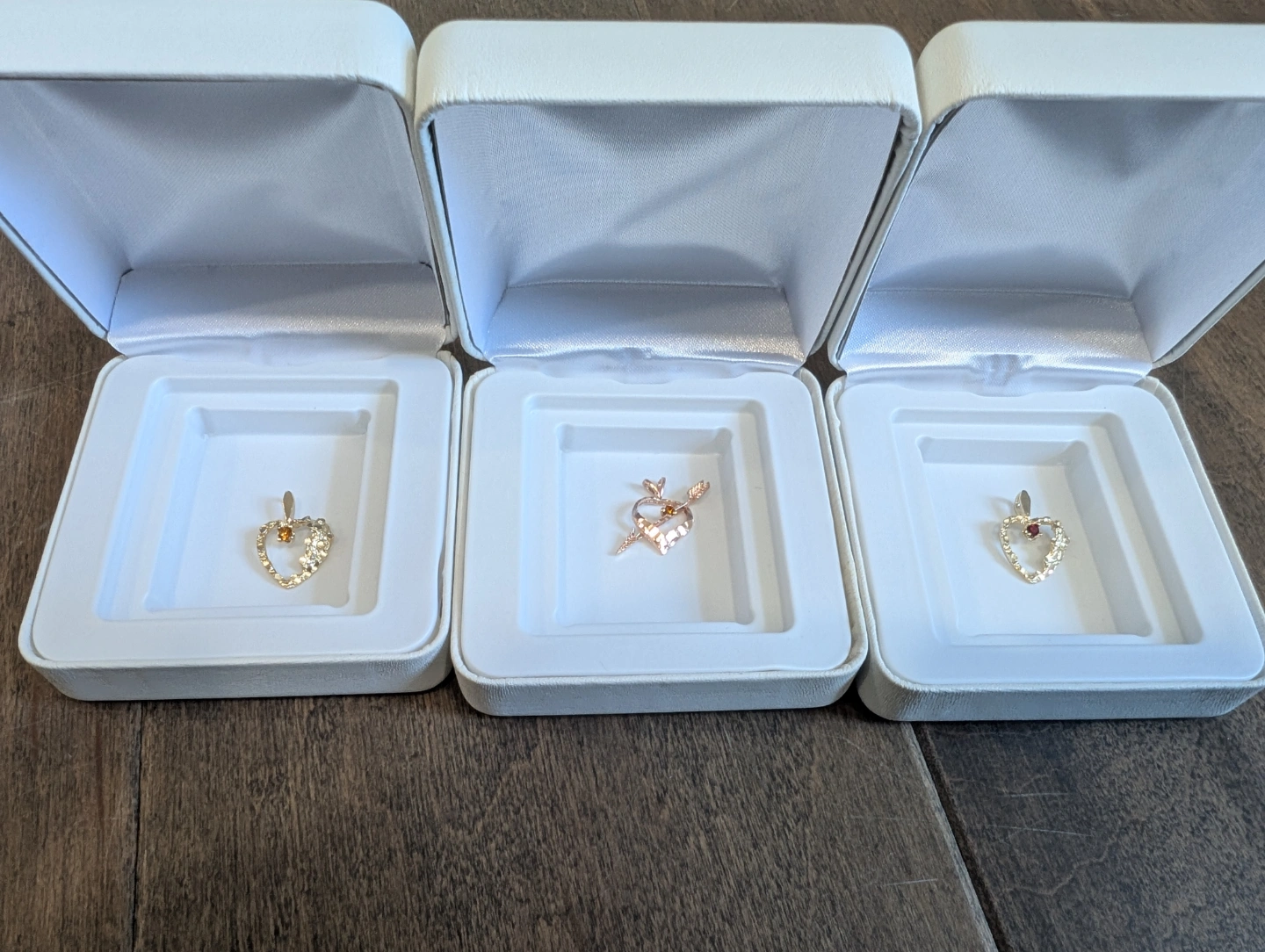 Brand new 10kt yellow gold heart pendants for necklace for sale. Comes with natural stone, cubic zirconia, moissanite diamond, natural amethyst gemstone, blue moissanite diamond. Perfect gift. $100 FIRM each.