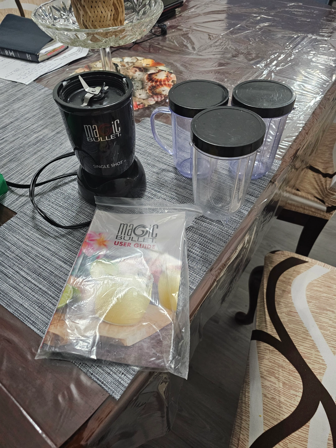 Magic Bullet Single Shot blender. Includes three cups and lids. User guide included. Great for smoothies and other drinks.