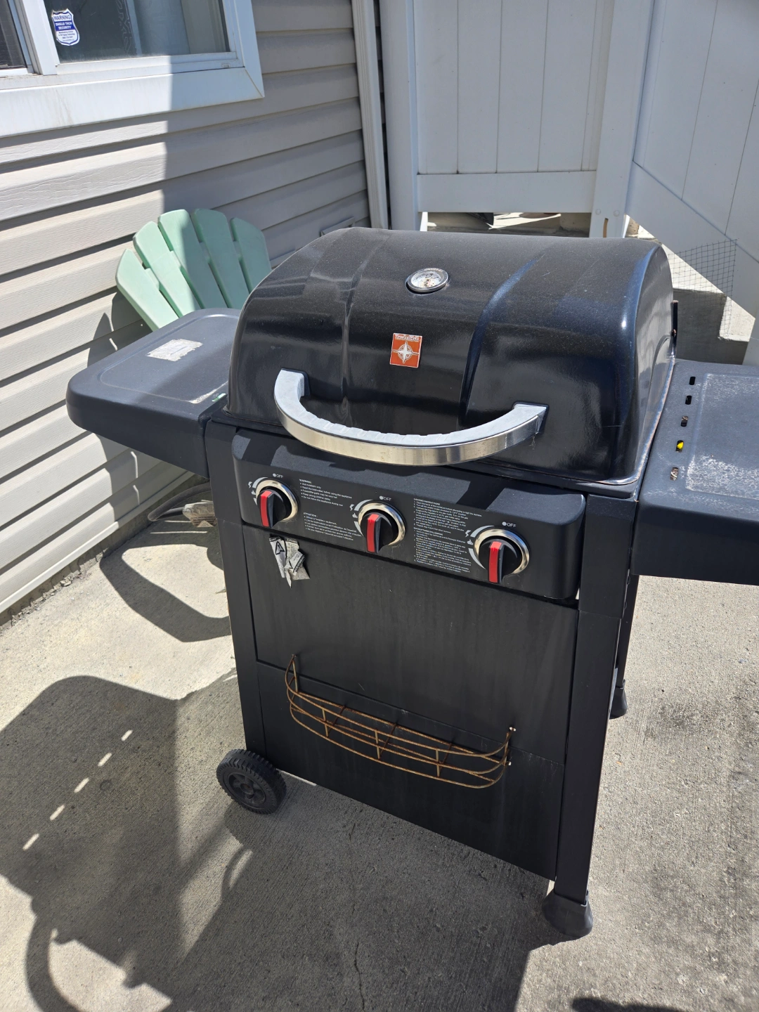 Black propane BBQ grill. Three burners. Features a side burner. Includes propane tank, showing some rust. Good for smaller gatherings.