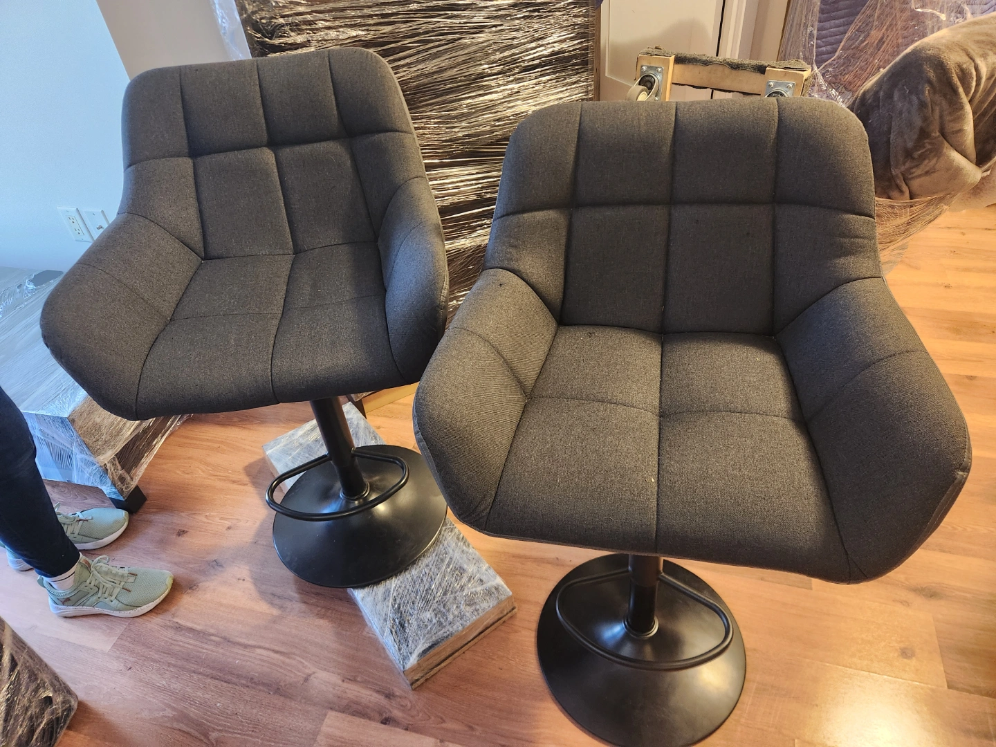 Two bar stools, dark grey fabric, adjustable height. Black metal base. Modern design. Good condition.