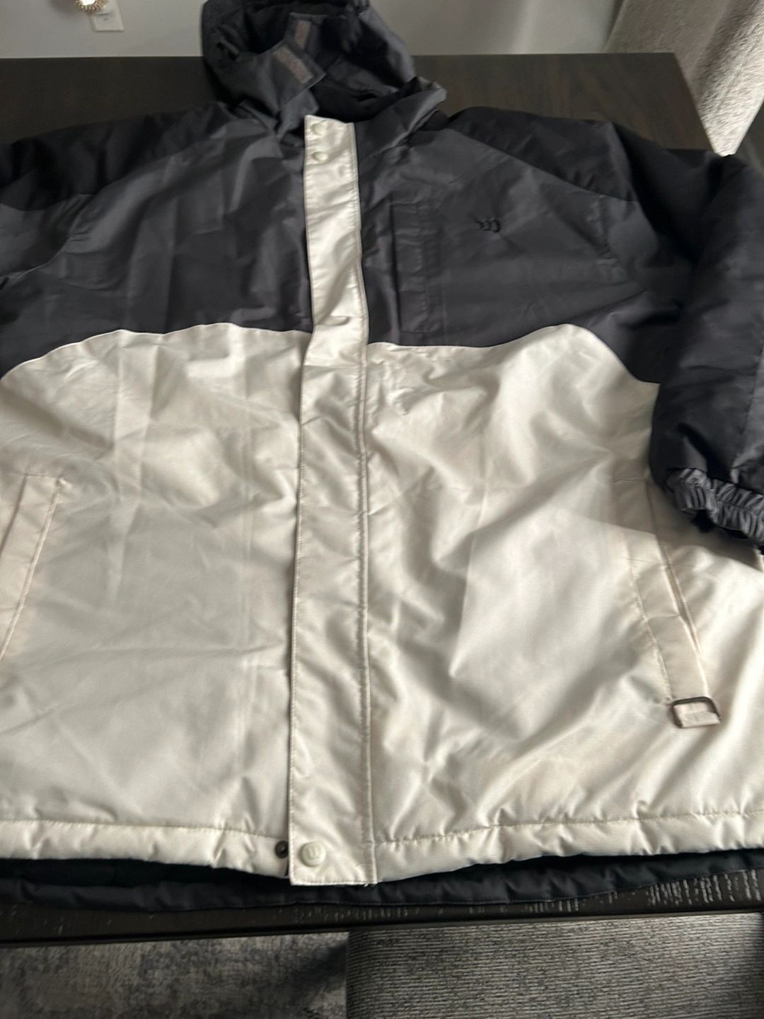 Men's winter jacket. Colour block design, black and off-white. Features a detachable hood, inner patch pocket, and waterproof coating. Excellent for outdoor activities.