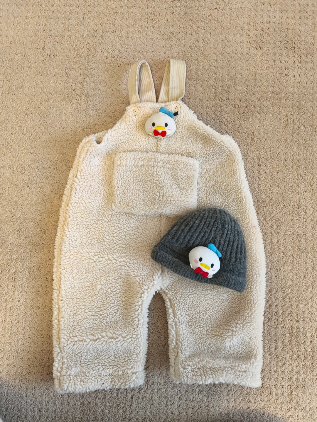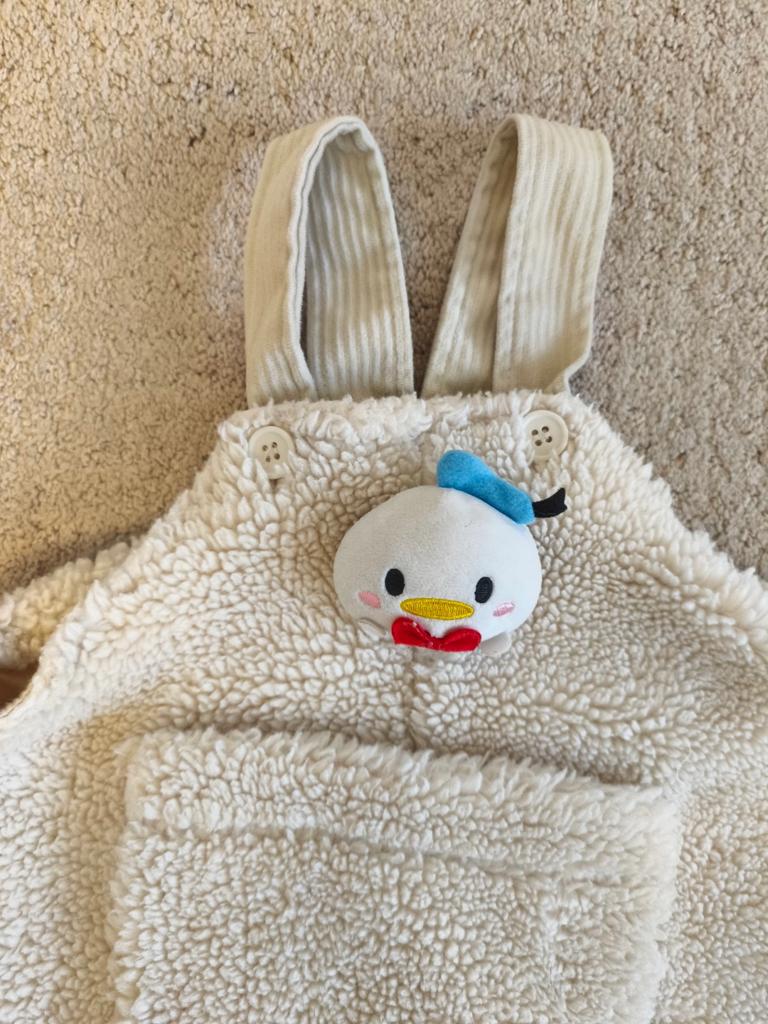 Cream-coloured sherpa overalls with cute Donald Duck pin. Matching grey beanie included. Perfect for keeping baby warm and cozy.