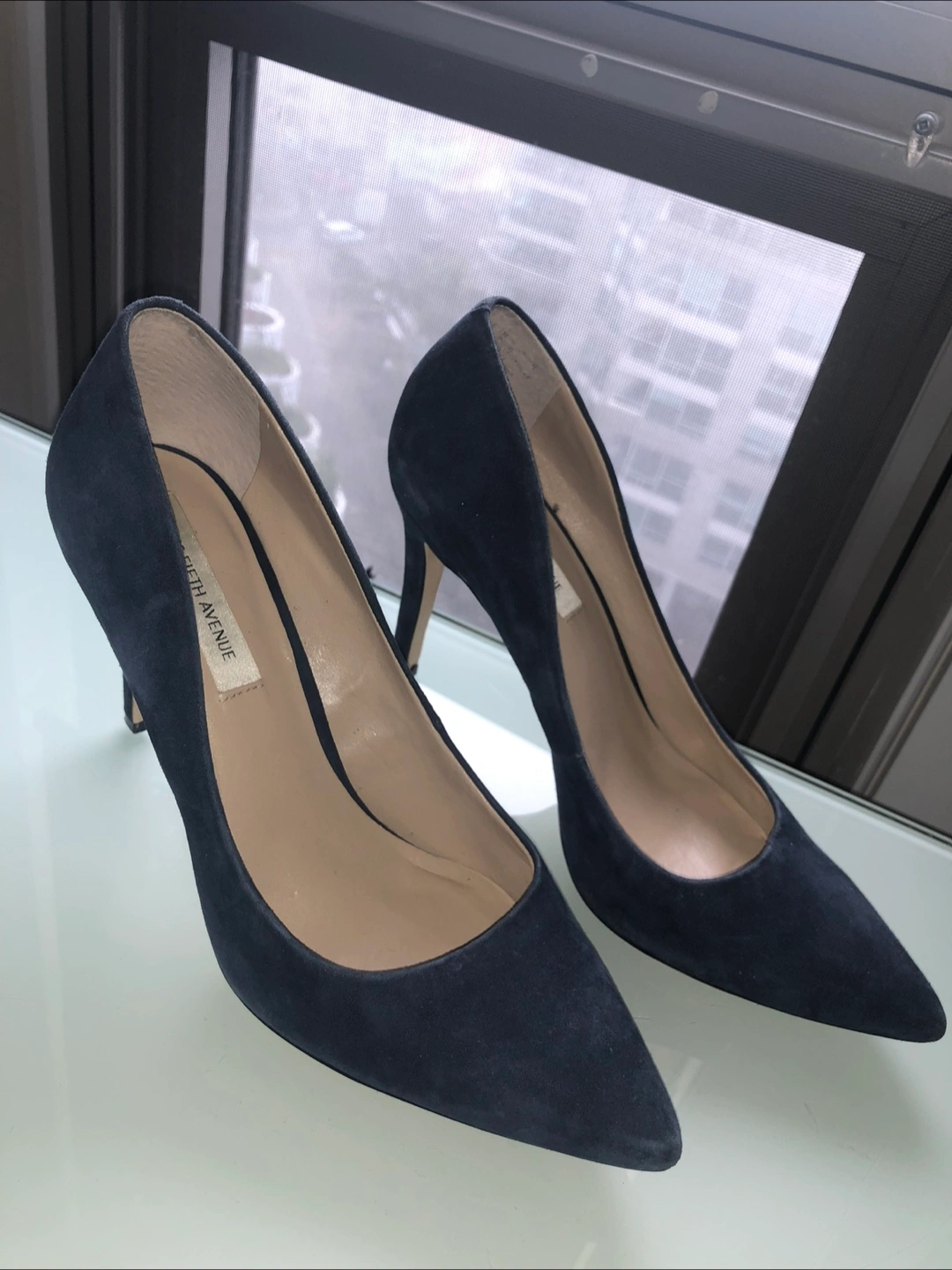 Beautiful navy blue suede heels. Pointed toe and classic style. Great for the office, a night out or special occasion.