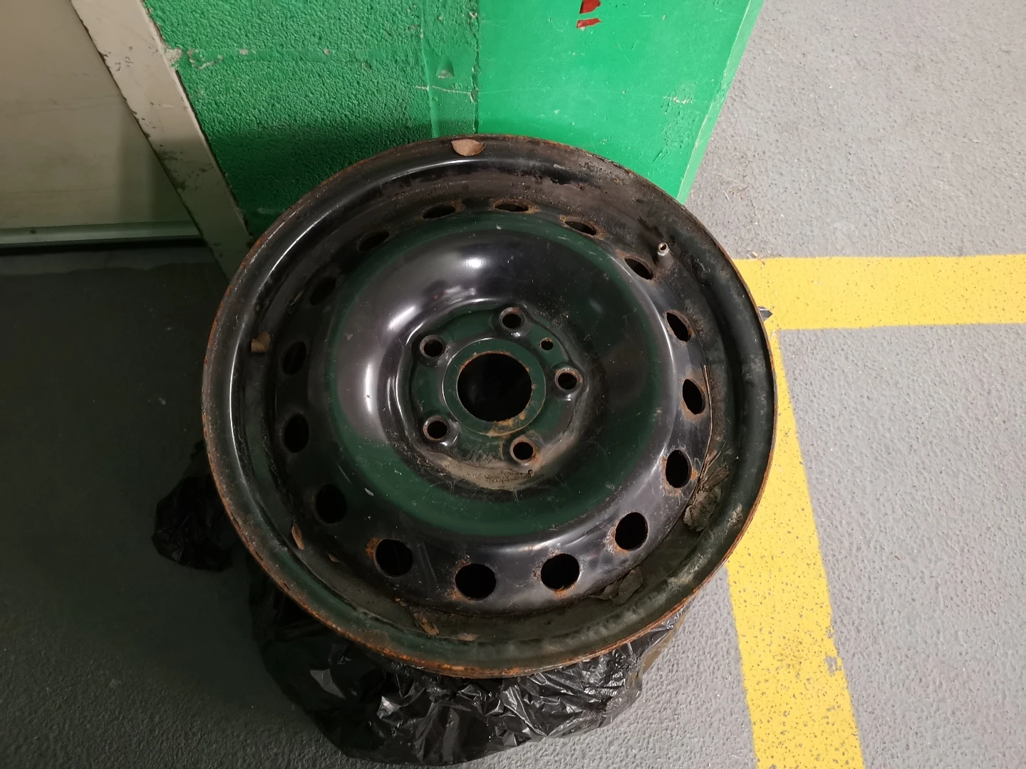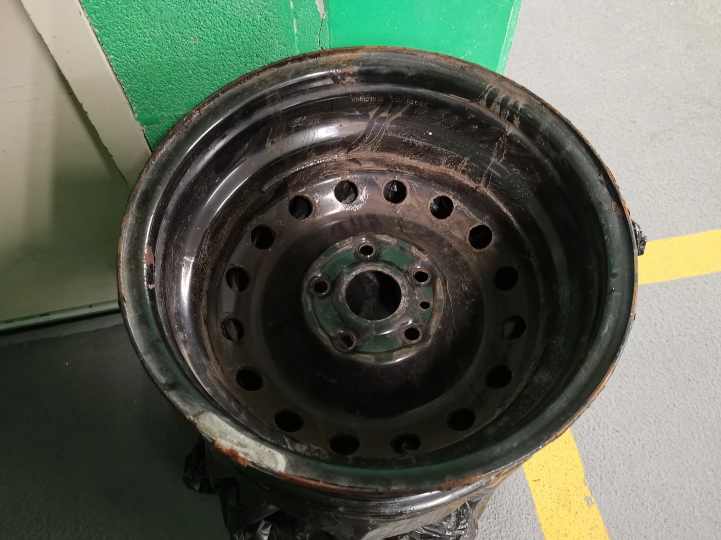 Used steel wheel. Shows some surface rust. Made in China. Part number X44559. Size 15x6.015-112E147/CB57. 15 inch diameter. Bolt patterns 5x114.3 and 67.1 center bore.