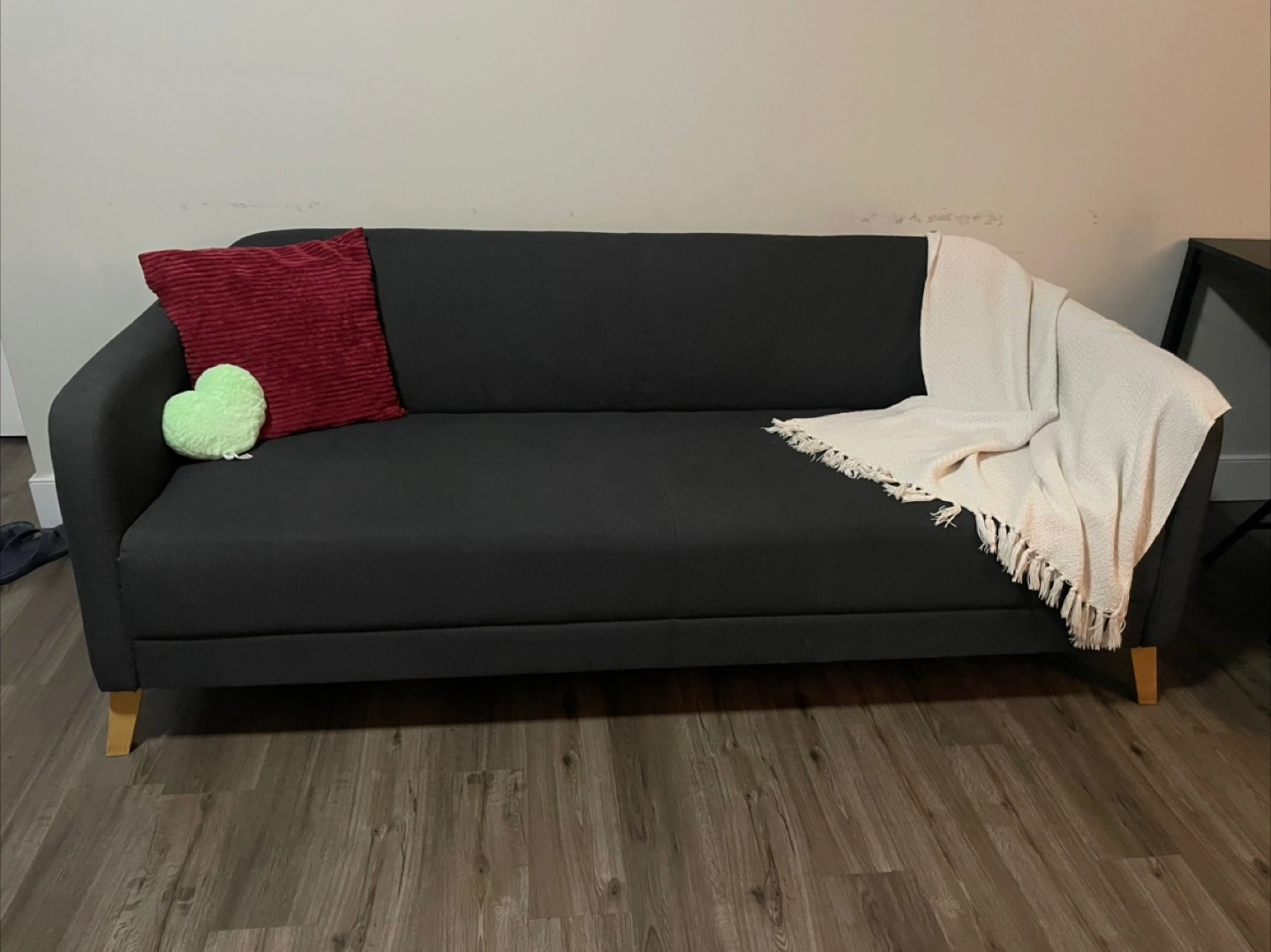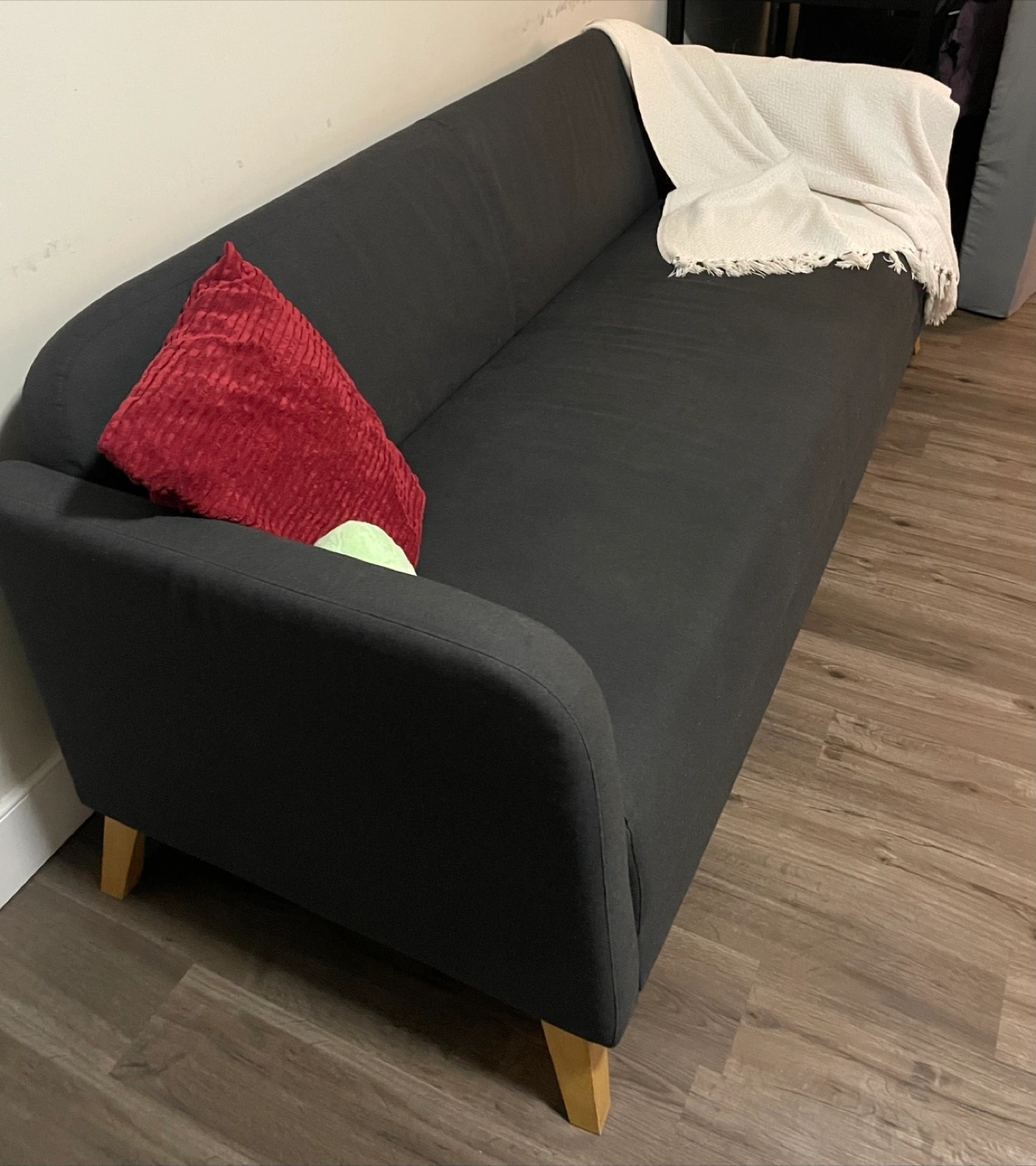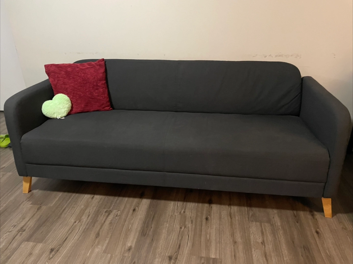 Comfortable sofa, dark grey fabric. Wooden legs.