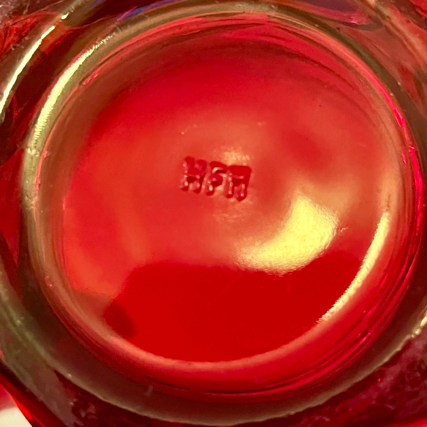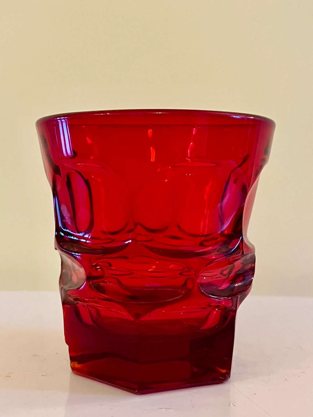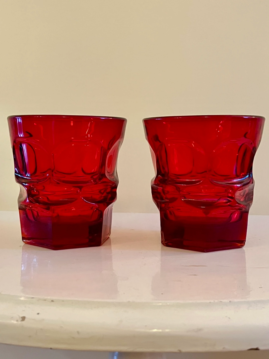Pair of rare vintage Fostoria Argus Ruby Red Barware Whiskey Tumblers in excellent condition. This striking red hue and distinctive design will add a touch of vintage elegance to your home bar. A beautiful and classic piece of barware! 3 7/8” tall.