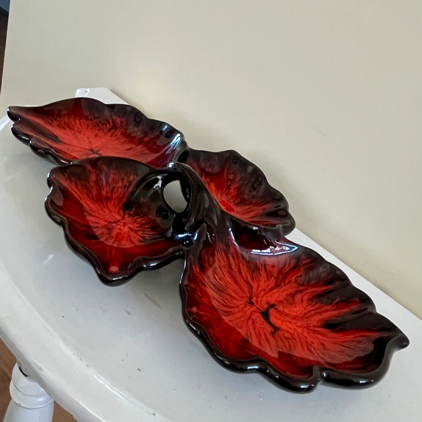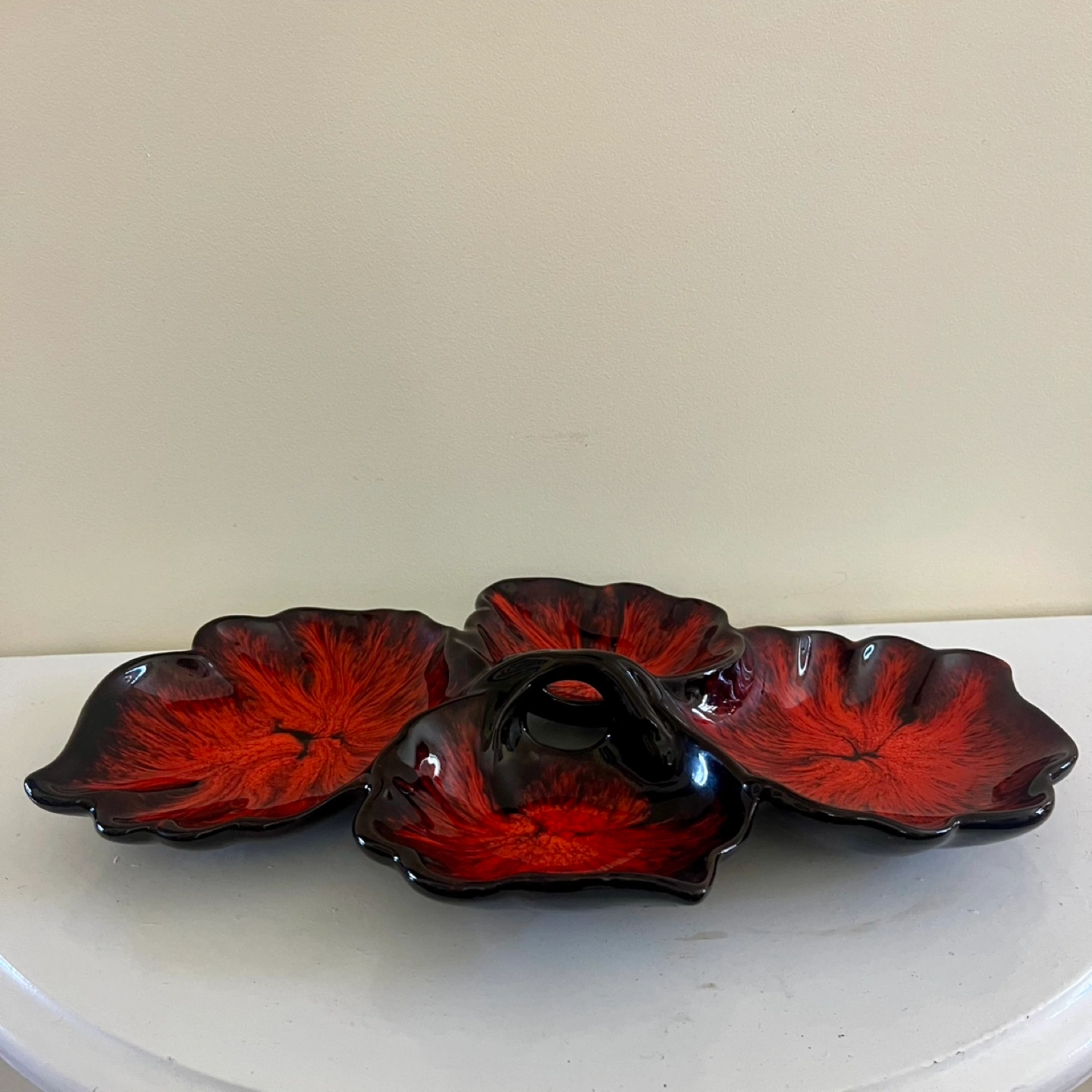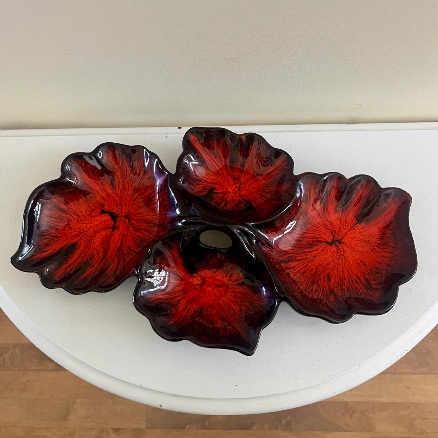 This striking four leaf patterned ceramic serving tray has a small finger sized handle in the middle. Excellent condition with no chips, cracks or repairs. Super shiny and lustrous, finish is superb. Base is marked - Evangeline, 1035, Canada.