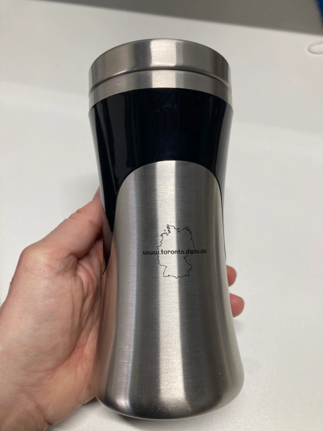 New with box. Stainless steel travel mug, Features a black band and laser etching of German Consulate of Toronto. Lid included. Made in China.