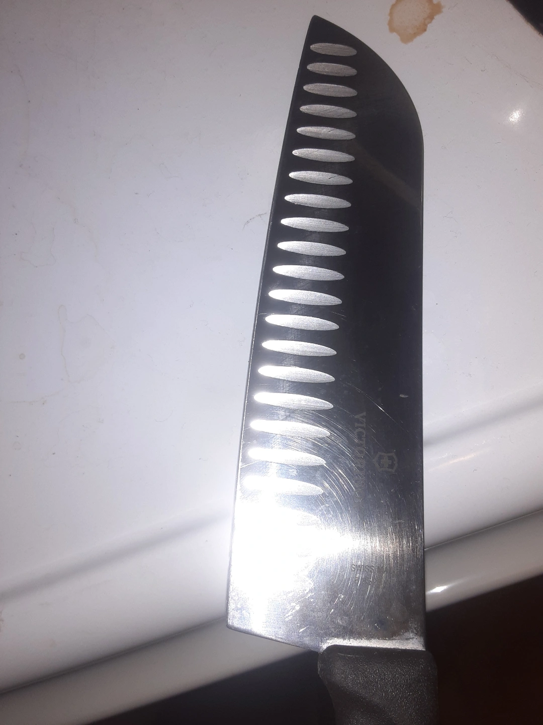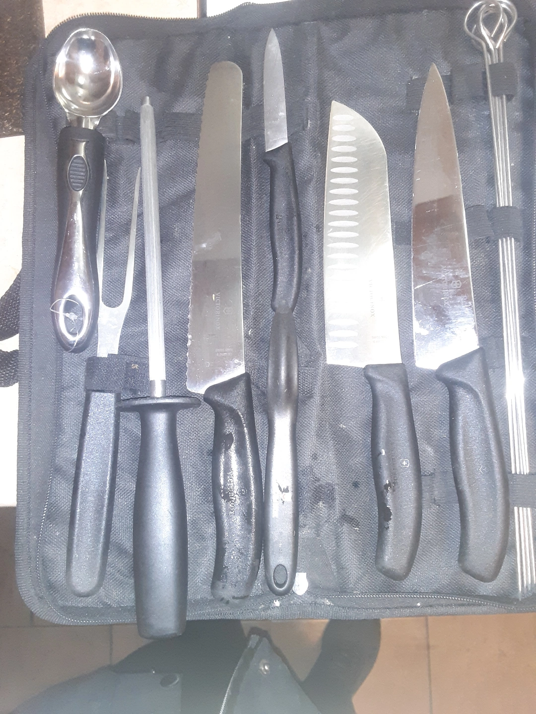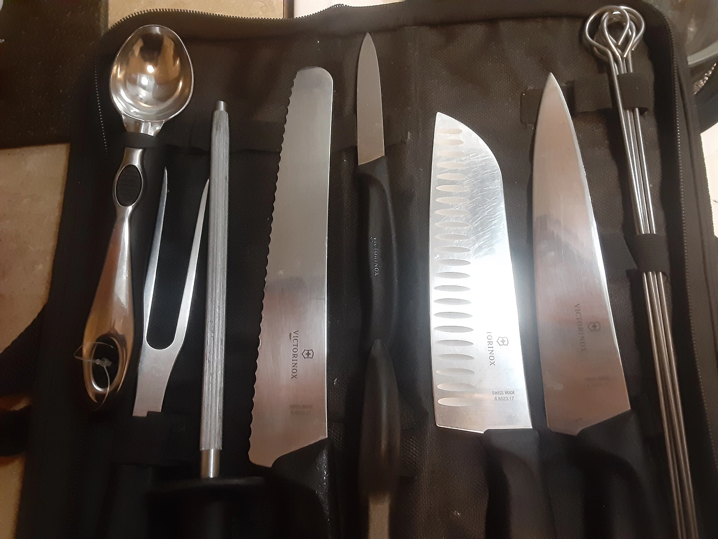 Seven-piece knife set. Includes chef's knife, bread knife, paring knife,fillet kife, sharpening steel, ice cream scoop, meat fork, fancy peeler, and skewers. All knives feature black Fibrox handles. Stored in a convenient carrying case.